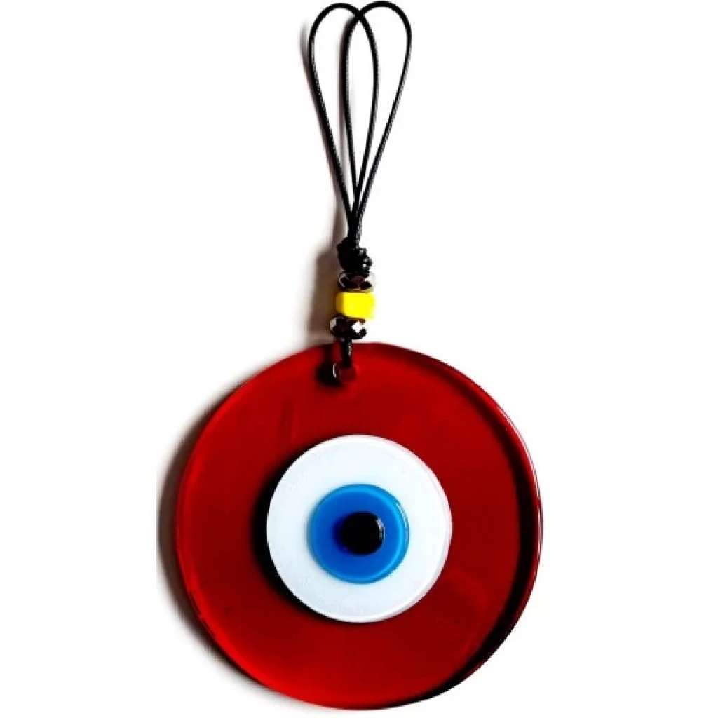 Mavi nazar boncuklu Kırmızı renk şeffaf duvar süsümüz 12 santimetre çapındadır. Ürünümüz ip dahil 22 santimetre boyundadır. El işçiliği ile üretilmiş ürünümüzde birinci kalite cam kullanılmıştır.