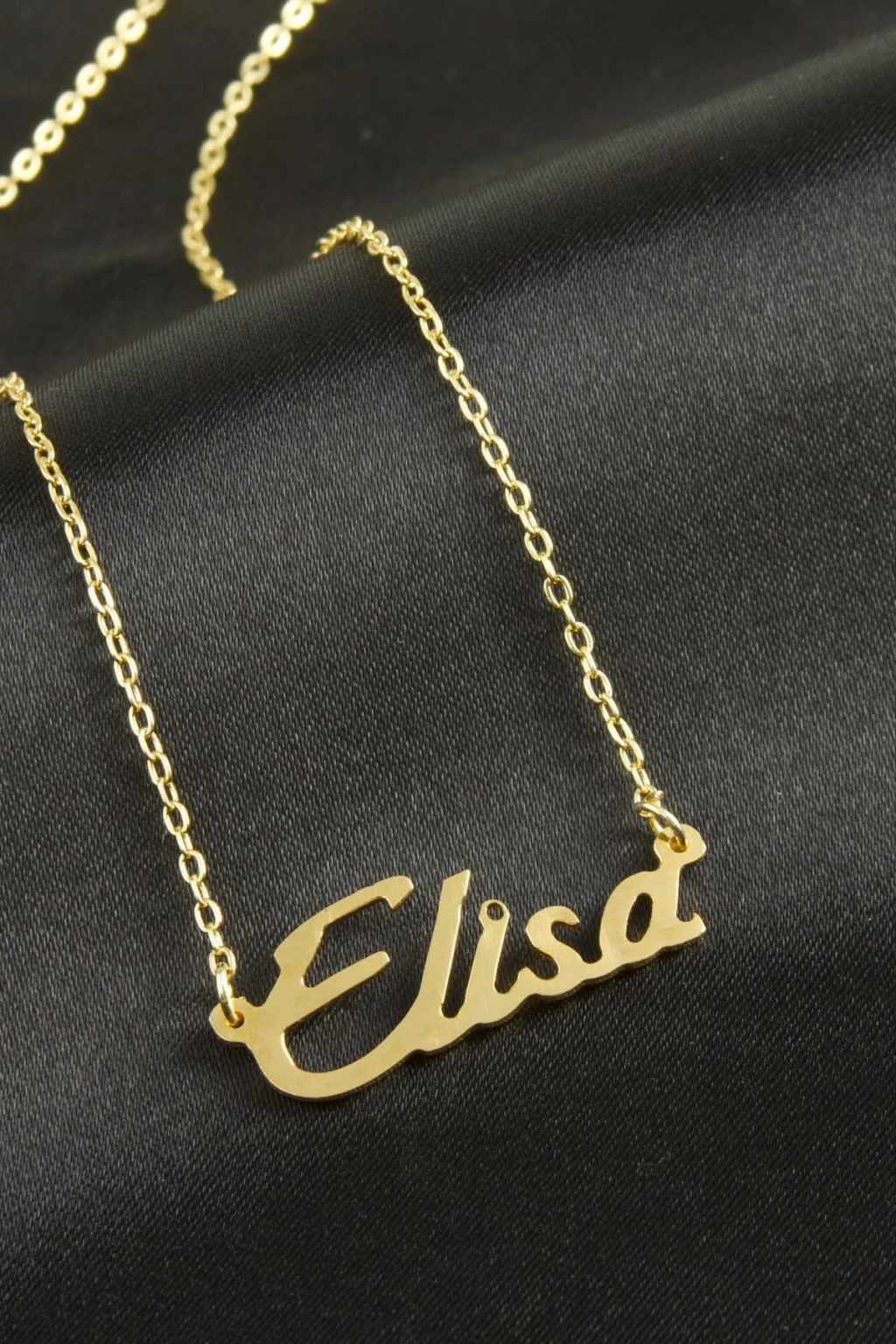 Elisa İsimli Kolye. İsimli kolye pirinç madeninden ve altın kaplamalıdır. Kişiye özel üretilmektedir.Yazdırmak istediğiniz ismi bize mesaj olarak iletmeniz gerekmektedir. Kullanıma bağlı olarak uzun süre kullanıma uygundur. Ürün malzemesi 1.sınıf kalitededir. Ürün ve zinciri sarı renktedir. Ürün zincir boyu 45 cm ve ürün üzerindeki isimler yaklaşık 3 cmdir. İsim boyları ürün ismine göre degişiklik göstermektedir.