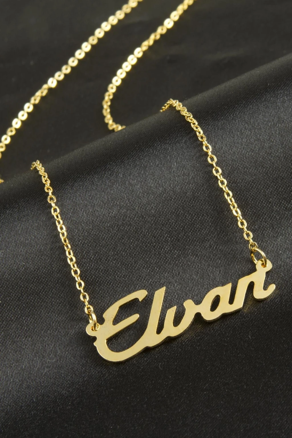 Elvan isimli kolye. İsimli kolye pirinç madeninden ve altın kaplamalıdır. Kişiye özel üretilmektedir.Yazdırmak istediğiniz ismi bize mesaj olarak iletmeniz gerekmektedir. Kullanıma bağlı olarak uzun süre kullanıma uygundur. Ürün malzemesi 1.sınıf kalitededir. Ürün ve zinciri sarı renktedir. Ürün zincir boyu 45 cm ve ürün üzerindeki isimler yaklaşık 3 cmdir. İsim boyları ürün ismine göre degişiklik göstermektedir.