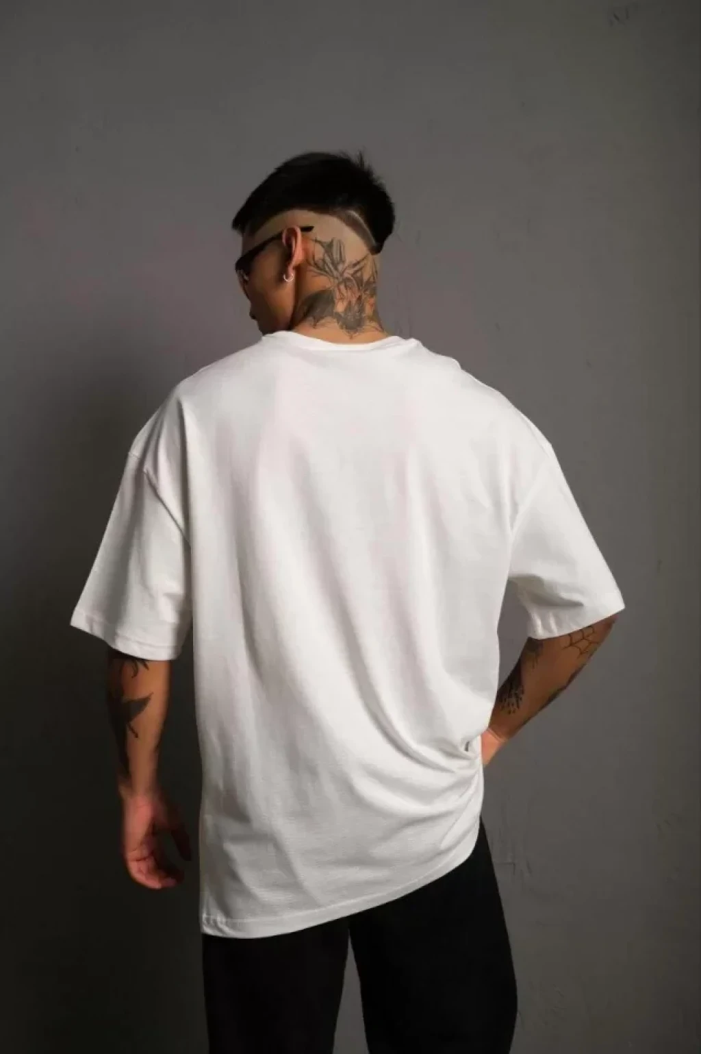 Bisiklet Yakalı Sırt Baskılı Oversize T-Shirt - Beyaz