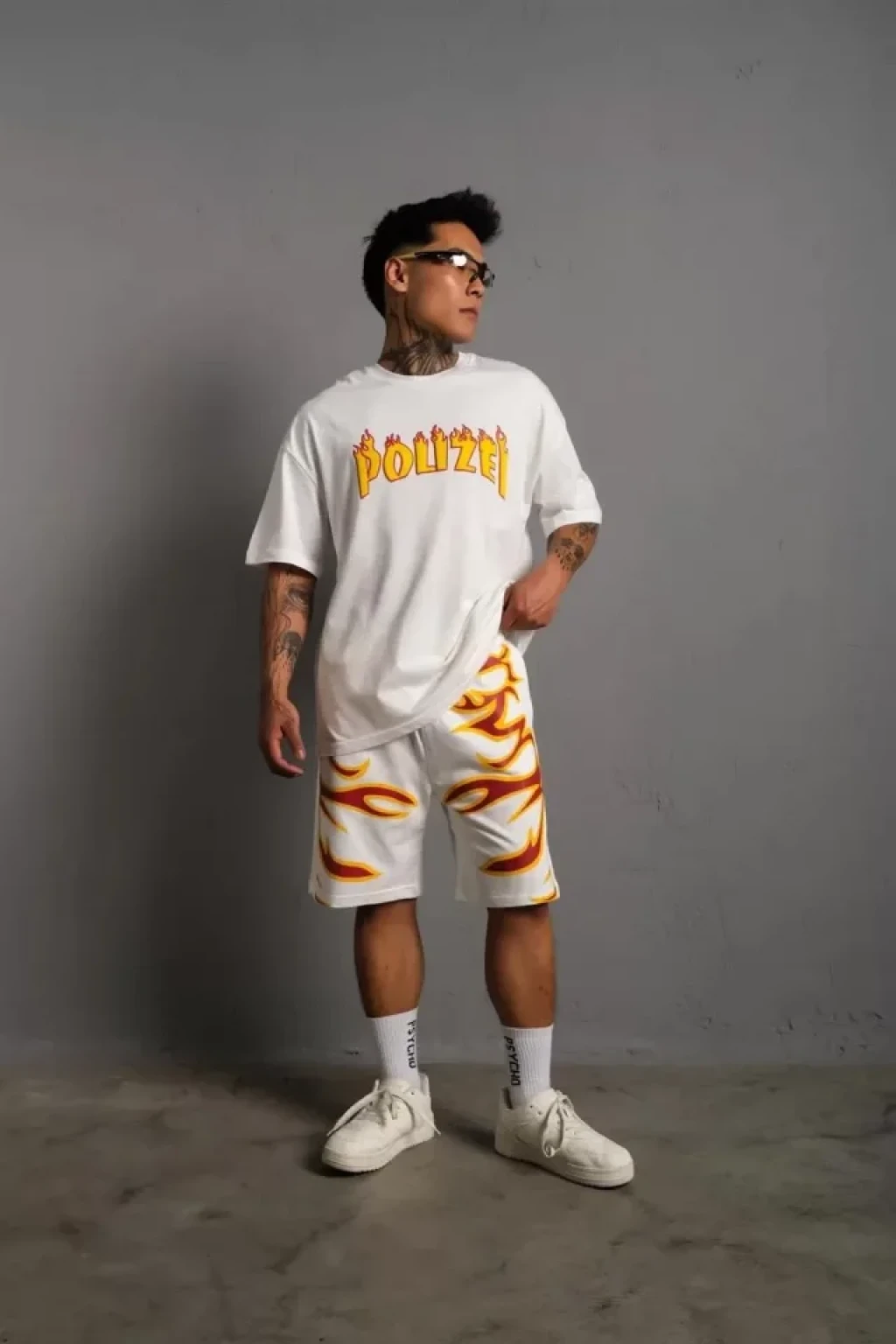 Erkek Alev Baskılı İkili Şortlu Takım - Beyaz