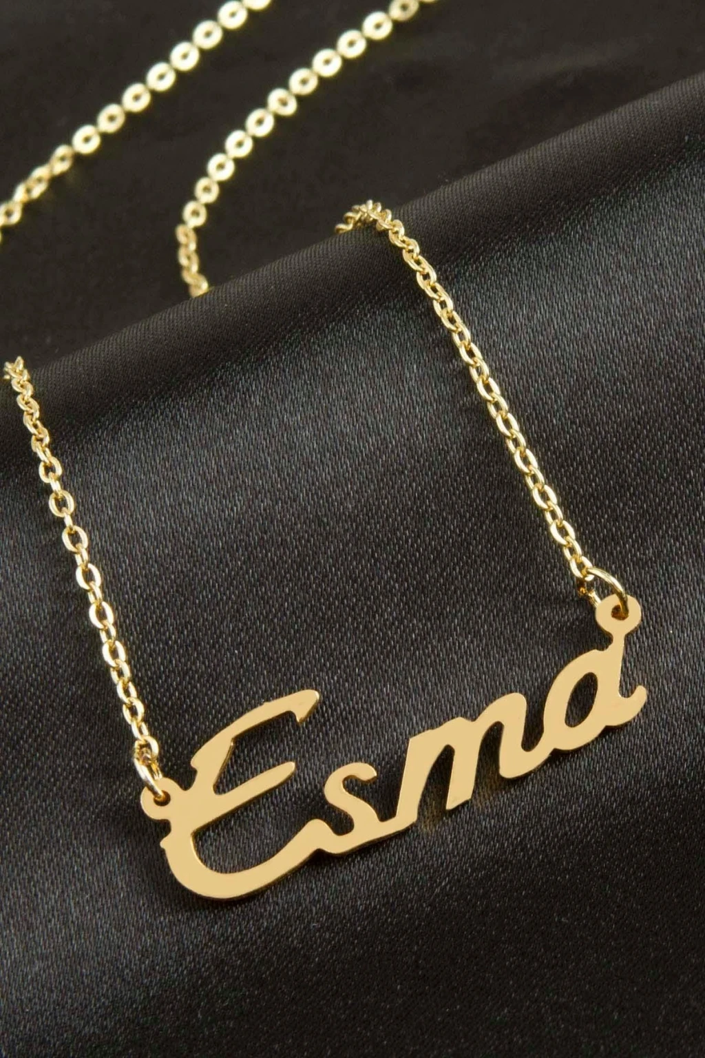 Esma isimli kolye. İsimli kolye pirinç madeninden ve altın kaplamalıdır. Kişiye özel üretilmektedir.Yazdırmak istediğiniz ismi bize mesaj olarak iletmeniz gerekmektedir. Kullanıma bağlı olarak uzun süre kullanıma uygundur. Ürün malzemesi 1.sınıf kalitededir. Ürün ve zinciri sarı renktedir. Ürün zincir boyu 45 cm ve ürün üzerindeki isimler yaklaşık 3 cmdir. İsim boyları ürün ismine göre degişiklik göstermektedir.