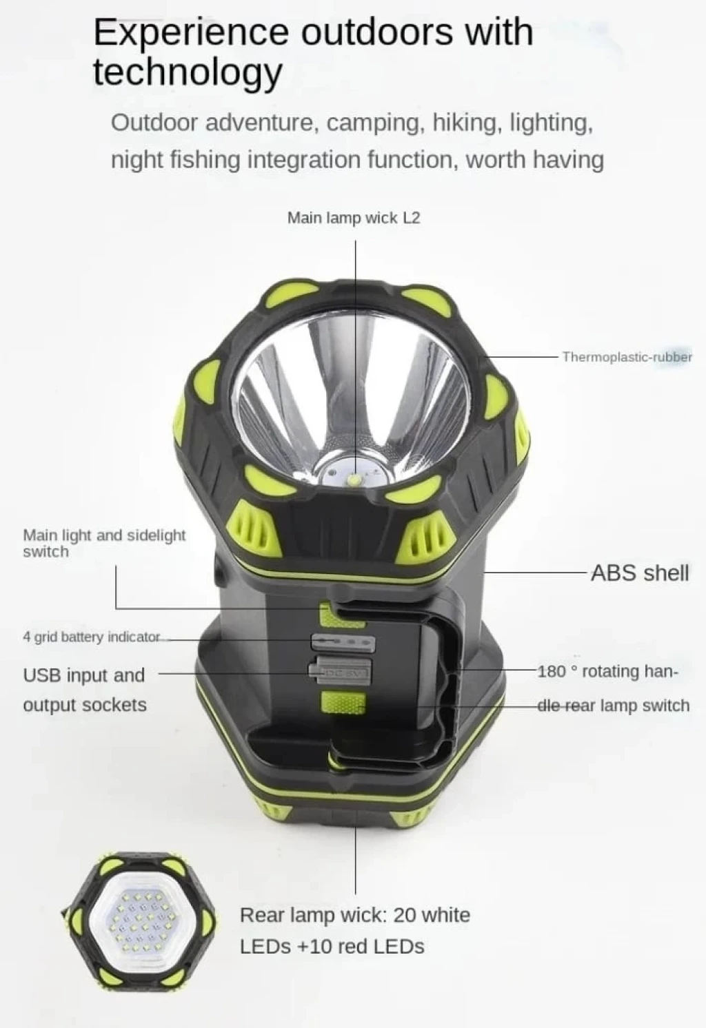 [Çalışma dişli]: ana ışık 4 dişli: ana ışık L2 güçlü Işık-ana ışık L2 zayıf ışık-sidelight güçlü ışık-sidelight zayıf ışık Arka ışık 4 dişli: arka ışık güçlü ışık-arka ışık zayıf ışık-kırmızı ışık-kırmızı ışık yanıp sönen [Uygulanabilir pil]: dahili 4800mah lityum pil i [Ürün malzemesi]: TPR olarak ABS [Çalışma gerilimi]: 3.7V