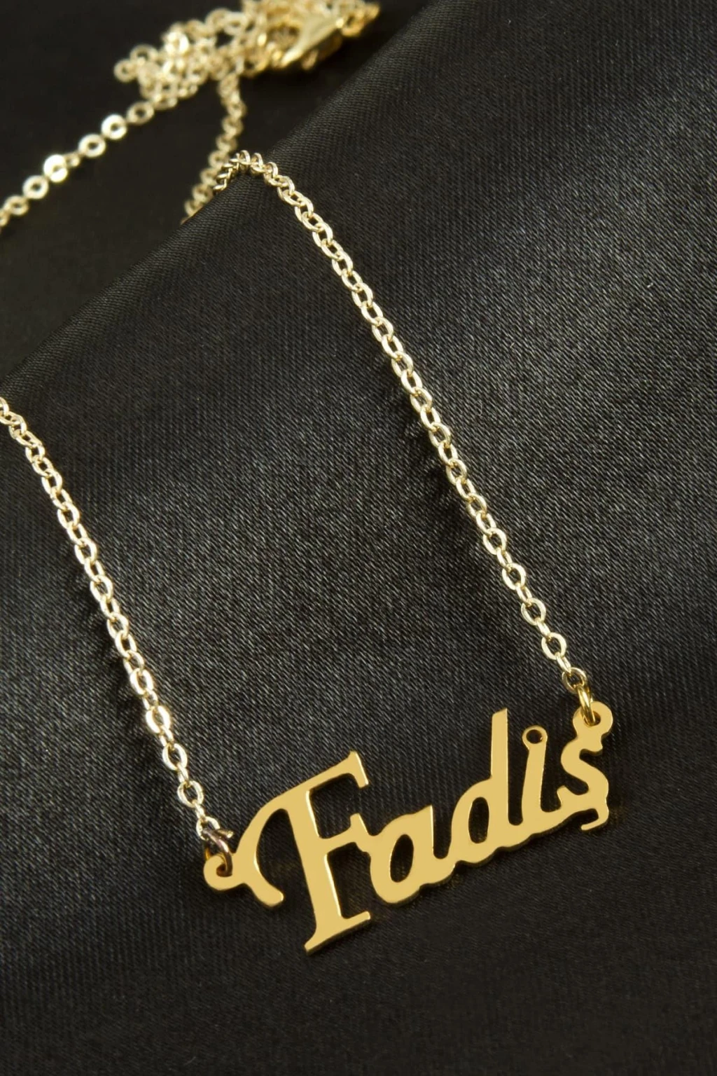 Fadiş isimli kolye. İsimli kolye pirinç madeninden ve altın kaplamalıdır. Kişiye özel üretilmektedir.Yazdırmak istediğiniz ismi bize mesaj olarak iletmeniz gerekmektedir. Kullanıma bağlı olarak uzun süre kullanıma uygundur. Ürün malzemesi 1.sınıf kalitededir. Ürün ve zinciri sarı renktedir. Ürün zincir boyu 45 cm ve ürün üzerindeki isimler yaklaşık 3 cmdir. İsim boyları ürün ismine göre degişiklik göstermektedir.