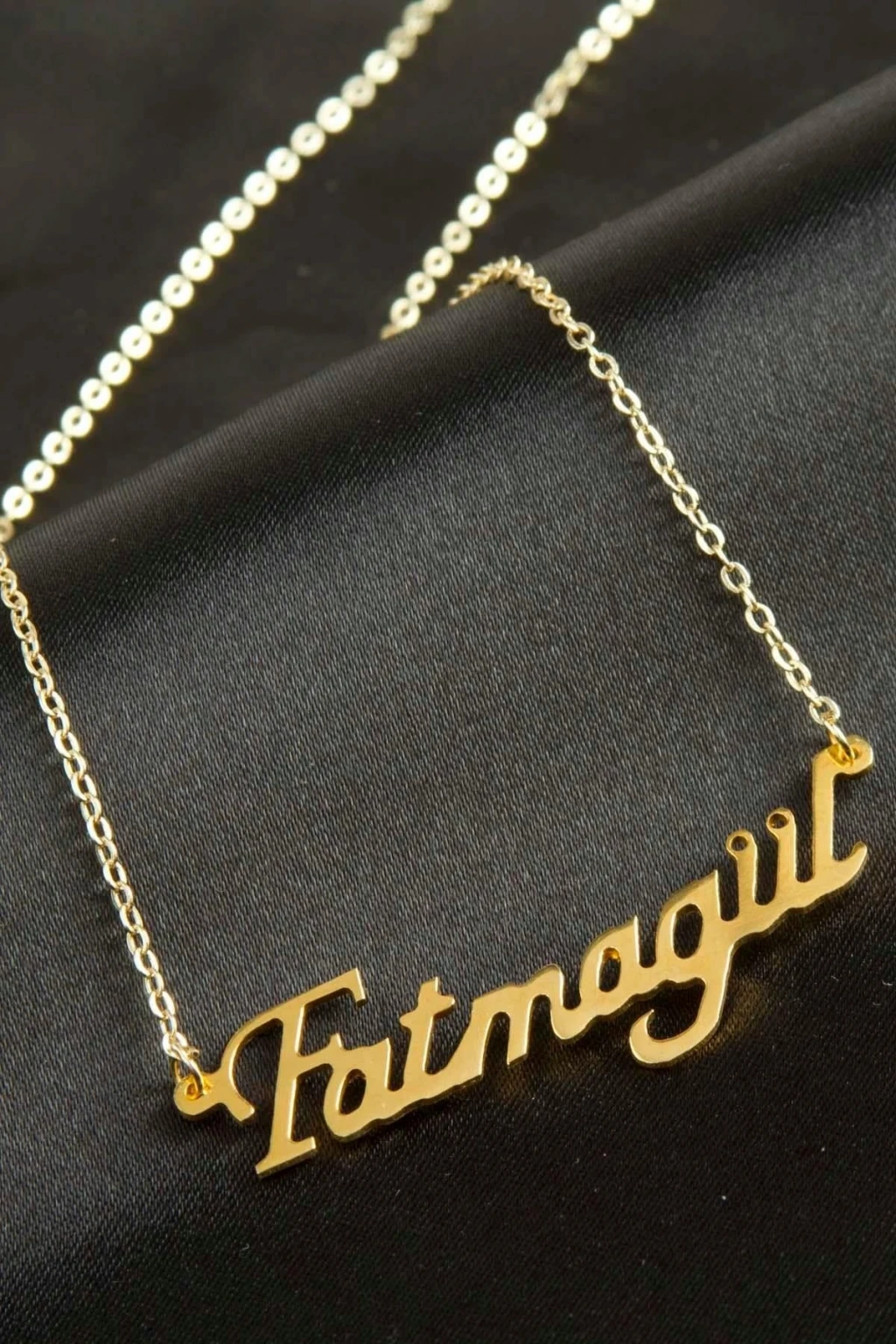 Fatmagül İsimli Kolye. İsimli kolye pirinç madeninden ve altın kaplamalıdır. Kişiye özel üretilmektedir.Yazdırmak istediğiniz ismi bize mesaj olarak iletmeniz gerekmektedir. Kullanıma bağlı olarak uzun süre kullanıma uygundur. Ürün malzemesi 1.sınıf kalitededir. Ürün ve zinciri sarı renktedir. Ürün zincir boyu 45 cm ve ürün üzerindeki isimler yaklaşık 3 cmdir. İsim boyları ürün ismine göre degişiklik göstermektedir.