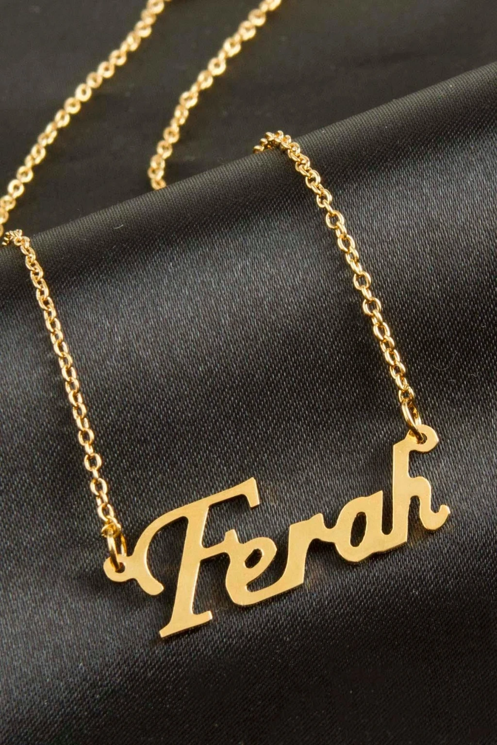 Ferah isimli kolye. İsimli kolye pirinç madeninden ve altın kaplamalıdır. Kişiye özel üretilmektedir.Yazdırmak istediğiniz ismi bize mesaj olarak iletmeniz gerekmektedir. Kullanıma bağlı olarak uzun süre kullanıma uygundur. Ürün malzemesi 1.sınıf kalitededir. Ürün ve zinciri sarı renktedir. Ürün zincir boyu 45 cm ve ürün üzerindeki isimler yaklaşık 3 cmdir. İsim boyları ürün ismine göre degişiklik göstermektedir.