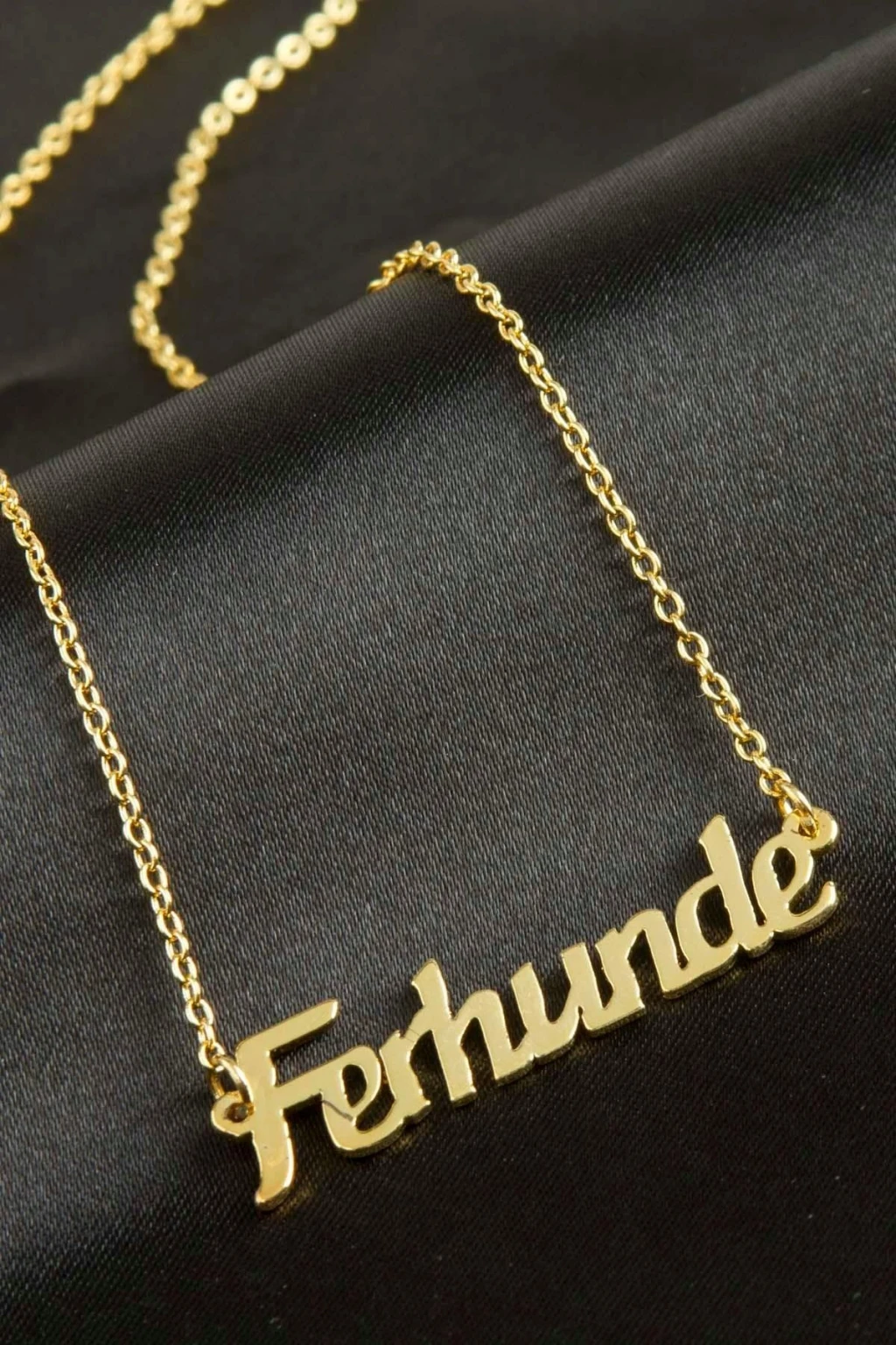 Ferhunde isimli kolye. İsimli kolye pirinç madeninden ve altın kaplamalıdır. Kişiye özel üretilmektedir.Yazdırmak istediğiniz ismi bize mesaj olarak iletmeniz gerekmektedir. Kullanıma bağlı olarak uzun süre kullanıma uygundur. Ürün malzemesi 1.sınıf kalitededir. Ürün ve zinciri sarı renktedir. Ürün zincir boyu 45 cm ve ürün üzerindeki isimler yaklaşık 3 cmdir. İsim boyları ürün ismine göre degişiklik göstermektedir.