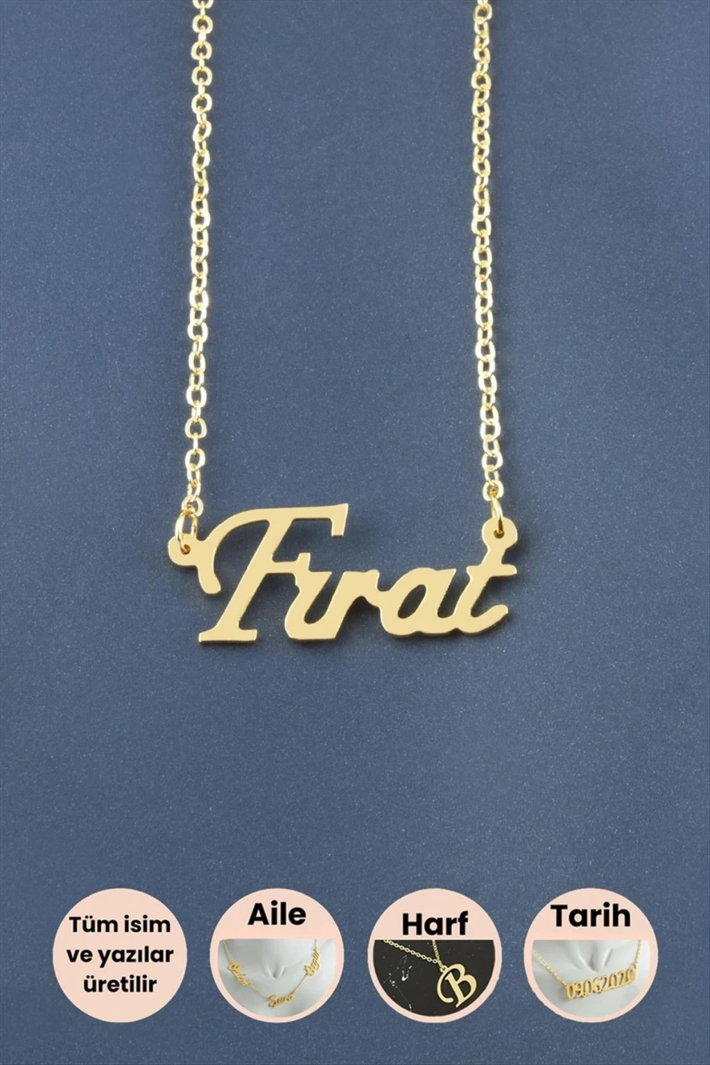 Fırat İsimli Kolye; İsimli kolye pirinç madeninden ve altın kaplamalıdır. Kişiye özel üretilmektedir. Yazdırmak istediğiniz ismi bize mesaj olarak iletmeniz gerekmektedir.; Kullanıma bağlı olarak uzun süre kullanıma uygundur. Ürün malzemesi 1.sınıf kalitededir. Ürün ve zinciri sarı renktedir. Ürün zincir boyu 45 cm ve ürün üzerindeki isimler yaklaşık 3 cmdir. İsim boyları ürün ismine göre degişiklik göstermektedir.