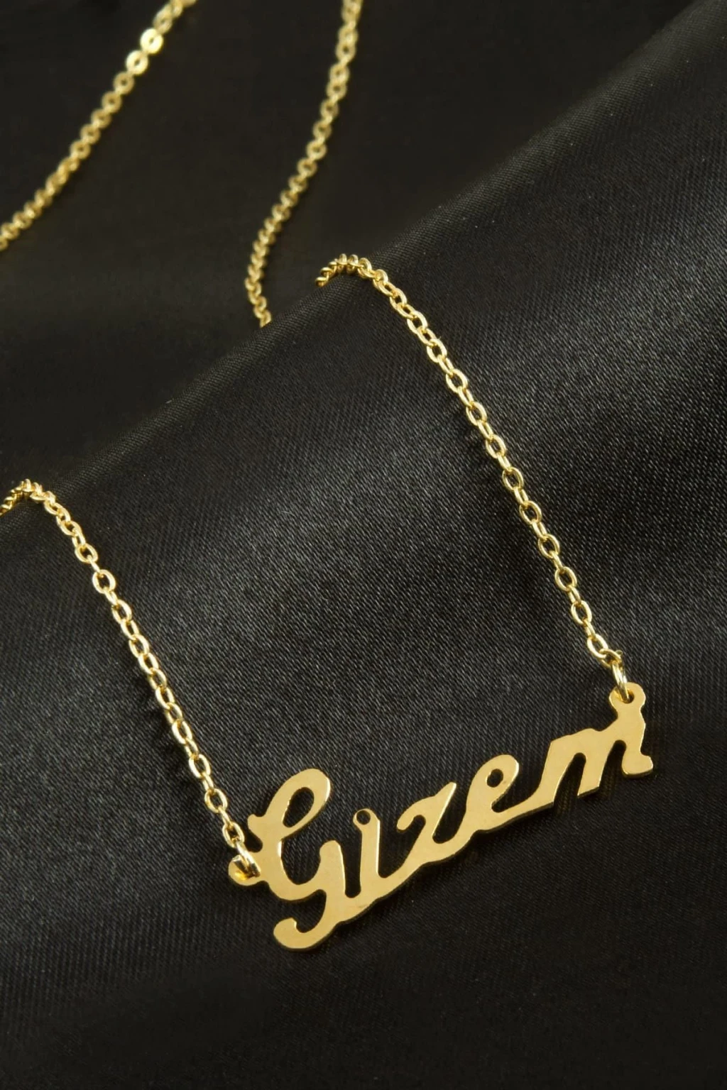 Gizem isimli kolye. İsimli kolye pirinç madeninden ve altın kaplamalıdır. Kişiye özel üretilmektedir.Yazdırmak istediğiniz ismi bize mesaj olarak iletmeniz gerekmektedir. Kullanıma bağlı olarak uzun süre kullanıma uygundur. Ürün malzemesi 1.sınıf kalitededir. Ürün ve zinciri sarı renktedir. Ürün zincir boyu 45 cm ve ürün üzerindeki isimler yaklaşık 3 cmdir. İsim boyları ürün ismine göre degişiklik göstermektedir.