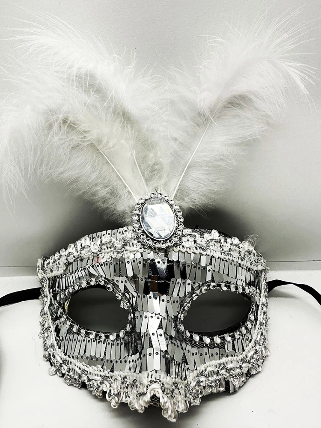 Gümüş Payetli Pullu Tüylü Parti Maskesi