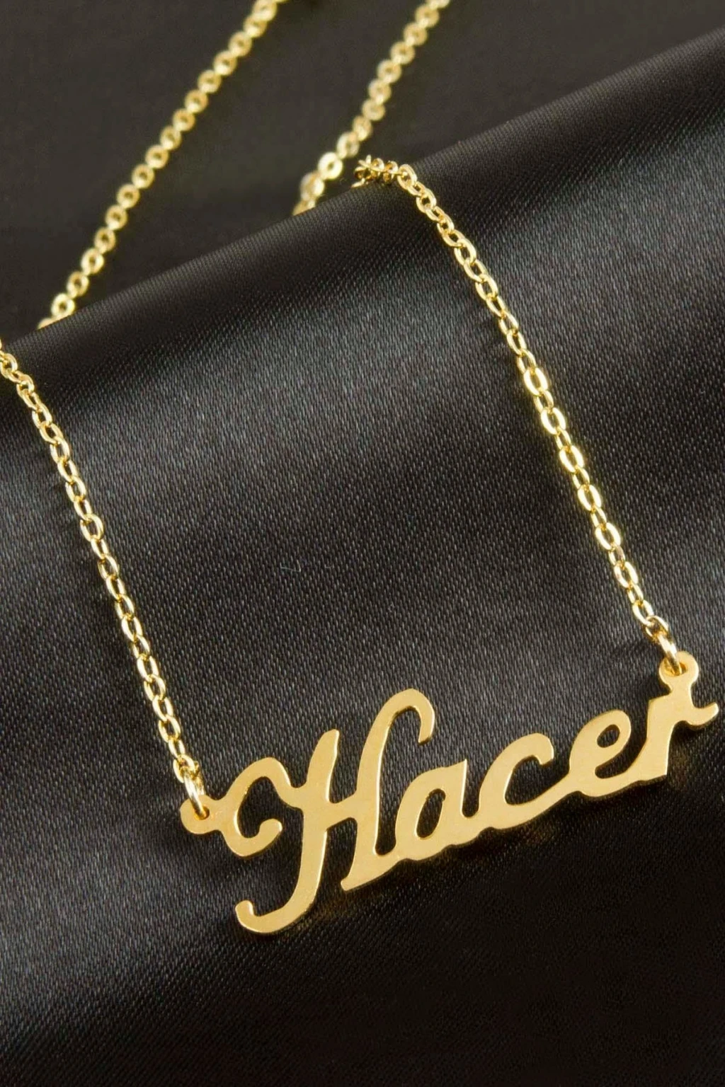 Hacer isimli kolye. İsimli kolye pirinç madeninden ve altın kaplamalıdır. Kişiye özel üretilmektedir.Yazdırmak istediğiniz ismi bize mesaj olarak iletmeniz gerekmektedir. Kullanıma bağlı olarak uzun süre kullanıma uygundur. Ürün malzemesi 1.sınıf kalitededir. Ürün ve zinciri sarı renktedir. Ürün zincir boyu 45 cm ve ürün üzerindeki isimler yaklaşık 3 cmdir. İsim boyları ürün ismine göre degişiklik göstermektedir.