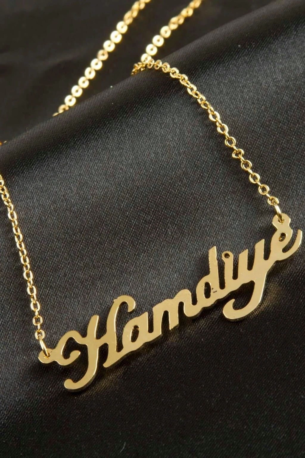 Hamdiye İsimli Kolye. İsimli kolye pirinç madeninden ve altın kaplamalıdır. Kişiye özel üretilmektedir.Yazdırmak istediğiniz ismi bize mesaj olarak iletmeniz gerekmektedir. Kullanıma bağlı olarak uzun süre kullanıma uygundur. Ürün malzemesi 1.sınıf kalitededir. Ürün ve zinciri sarı renktedir. Ürün zincir boyu 45 cm ve ürün üzerindeki isimler yaklaşık 3 cmdir. İsim boyları ürün ismine göre degişiklik göstermektedir.
