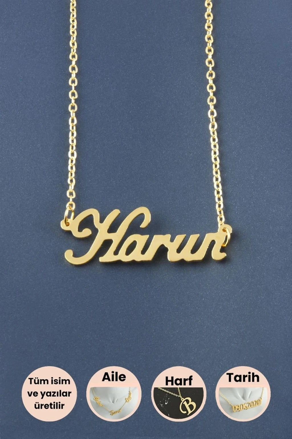 Harun İsimli Kolye; İsimli kolye pirinç madeninden ve altın kaplamalıdır. Kişiye özel üretilmektedir. Yazdırmak istediğiniz ismi bize mesaj olarak iletmeniz gerekmektedir.; Kullanıma bağlı olarak uzun süre kullanıma uygundur. Ürün malzemesi 1.sınıf kalitededir. Ürün ve zinciri sarı renktedir. Ürün zincir boyu 45 cm ve ürün üzerindeki isimler yaklaşık 3 cmdir. İsim boyları ürün ismine göre degişiklik göstermektedir.