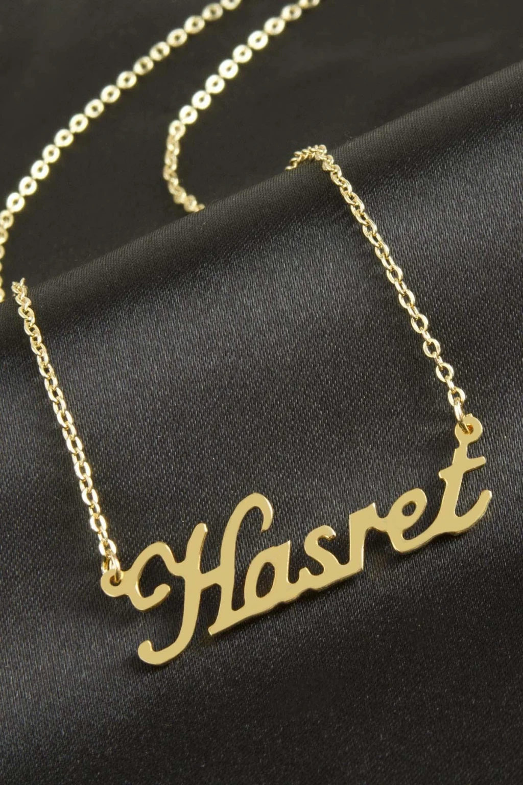 Hasret isimli kolye. İsimli kolye pirinç madeninden ve altın kaplamalıdır. Kişiye özel üretilmektedir.Yazdırmak istediğiniz ismi bize mesaj olarak iletmeniz gerekmektedir. Kullanıma bağlı olarak uzun süre kullanıma uygundur. Ürün malzemesi 1.sınıf kalitededir. Ürün ve zinciri sarı renktedir. Ürün zincir boyu 45 cm ve ürün üzerindeki isimler yaklaşık 3 cmdir. İsim boyları ürün ismine göre degişiklik göstermektedir.