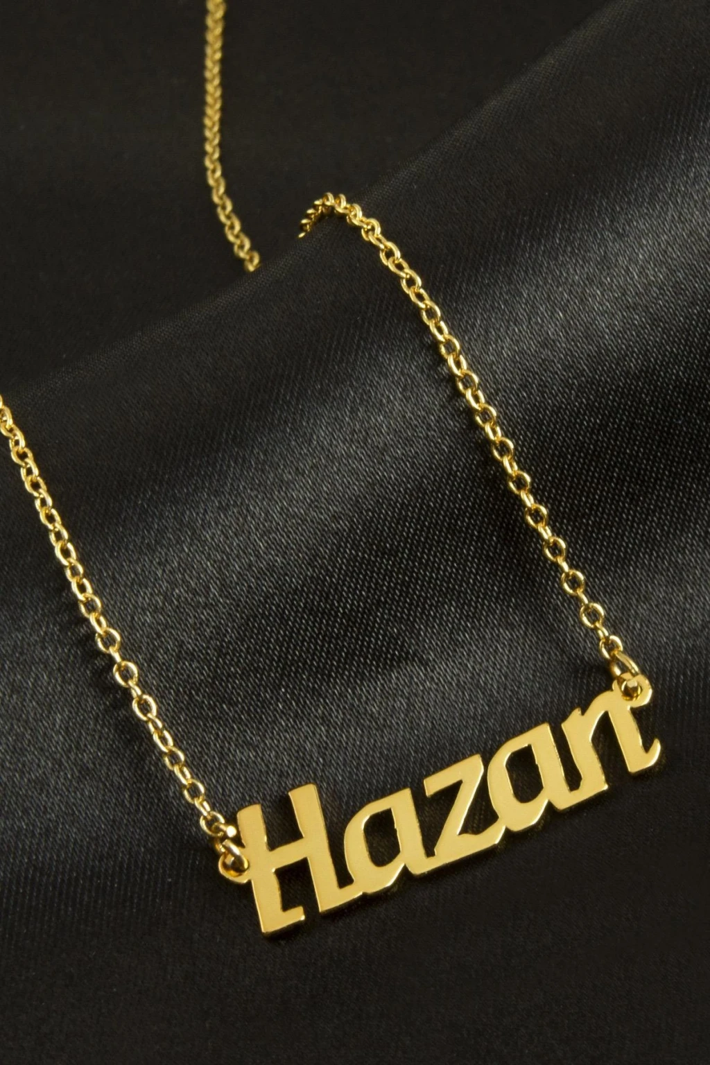 Hazan isimli kolye. İsimli kolye pirinç madeninden ve altın kaplamalıdır. Kişiye özel üretilmektedir.Yazdırmak istediğiniz ismi bize mesaj olarak iletmeniz gerekmektedir. Kullanıma bağlı olarak uzun süre kullanıma uygundur. Ürün malzemesi 1.sınıf kalitededir. Ürün ve zinciri sarı renktedir. Ürün zincir boyu 45 cm ve ürün üzerindeki isimler yaklaşık 3 cmdir. İsim boyları ürün ismine göre degişiklik göstermektedir.