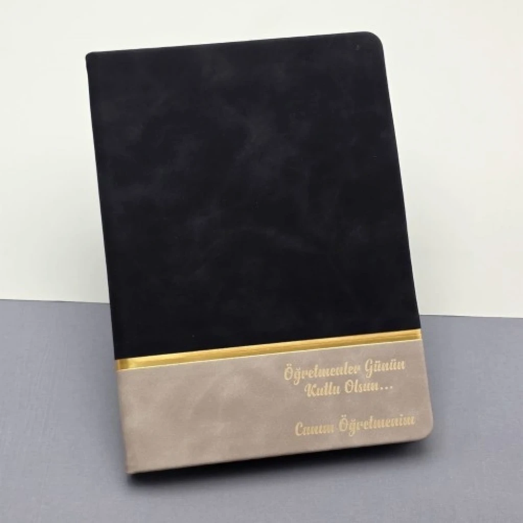 24 Kasım Öğretmenler Günü Hediyesi 24 Kasım Öğretmenler Günü için özel olarak tasarlanan siyah termo deri defter, şık altın yaldız detayları ve üzerindeki “Öğretmenler Günün Kutlu Olsun Canım Öğretmenim” yazısıyla öğretmenlere verilebilecek en anlamlı hediyelerden biridir. Estetik tasarımı, kaliteli malzemesi ve özel lazer baskısı sayesinde hem uzun ömürlü hem de göz alıcı bir hediyelik üründür.Öğretmenler Günü hediyeleri arasında en çok tercih edilen modellerden biri olan bu özel defter, öğretmeninizin masasında kullanabileceği, her baktığında sizi hatırlayacağı zarif bir armağan sunar. 96 yaprak çizgili sayfa yapısı ve iç kısmındaki ayraç ipi ile hem pratik hem de kullanışlıdır.ÖzelliklerKaliteli termo deri malzemeden üretilmiştir.96 yaprak (192 sayfa) çizgili iç sayfa yapısı.Üzerindeki yazı lazer baskıdır; kalıcı ve silinmez.Siyah zemin üzerinde altın yaldız tasarım.Öğretmenler Günü’ne özel tasarım.İç kısmında ayraç ip bulunmaktadır.Şık, modern ve dikkat çekici görünüm.Ürün ölçüsü: 21 cm x 15 cm