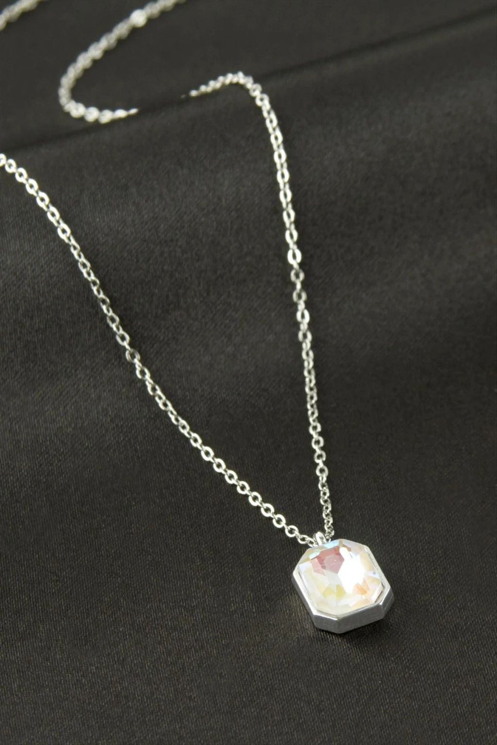 Kolye; Ürün malzemesi zincir bölümü çeliktir. Zincir uzunluğu 45 cm ve ucundaki cam taş boyu 1,2 cmdir. Kartlıdır.