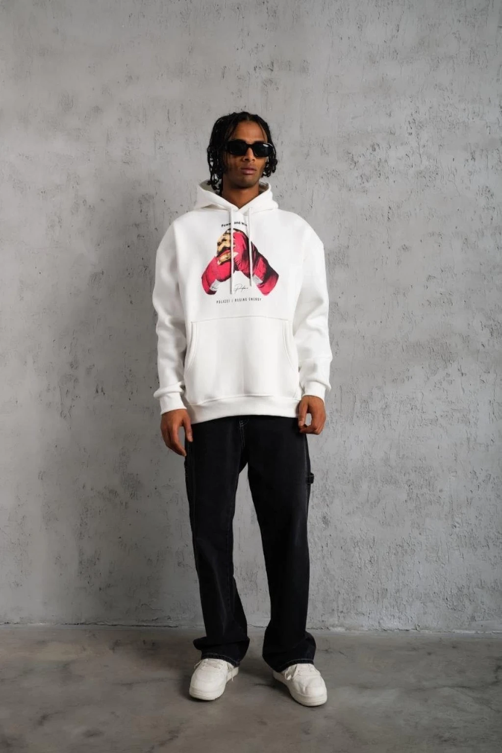 ieg™ Eldiven Baskılı Kapüşonlu Sweat - Beyaz -