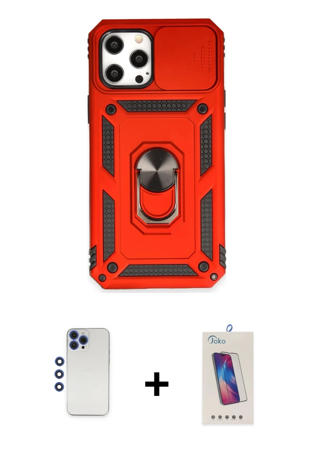 iPhone 12 Pro Max Kılıf Ahenk Klasik - Siyah Joko 5D Cam + Lacivert Shine Kamera Lens