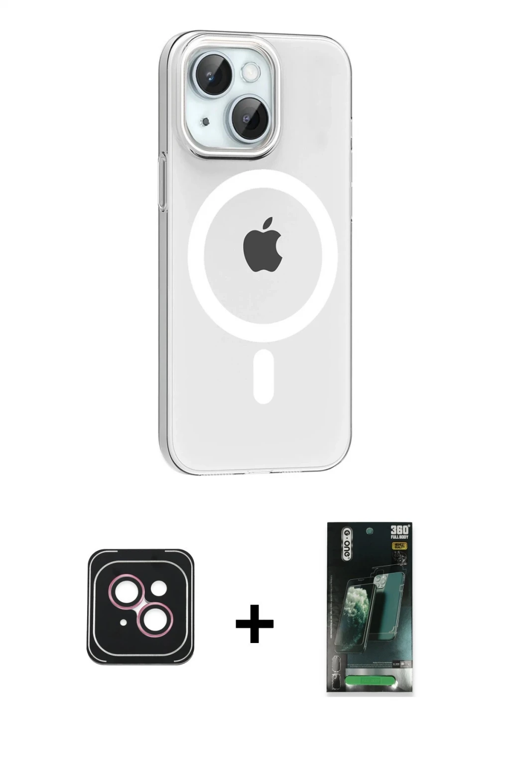 iPhone 14 Pusula Form Özel Seri - Şeffaf 360 Full Body Arka Koruyucu + Pembe PVD Metal Kamera Lens, iPhone 14 modeli için kılıf, ekran koruyucu ve kamera lens koruyucuyu bir araya getiren premium bir settir. Görünümde kılıfta Siyah tonu, lens koruyucuda Pembe detay ile bütünlüklü ve dikkat çekici bir stil sunar. Set; günlük kullanıma uygun şık koruma, ekranı çizilme ve darbelere karşı destekleyen koruma ve kamera bölümünü ekstra güvenceye alan koruma sağlayarak cihazınızı günlük kullanıma karşı destekler. Tek paketle hem estetik hem de kapsamlı korumayı pratik şekilde tamamlayabilirsiniz.