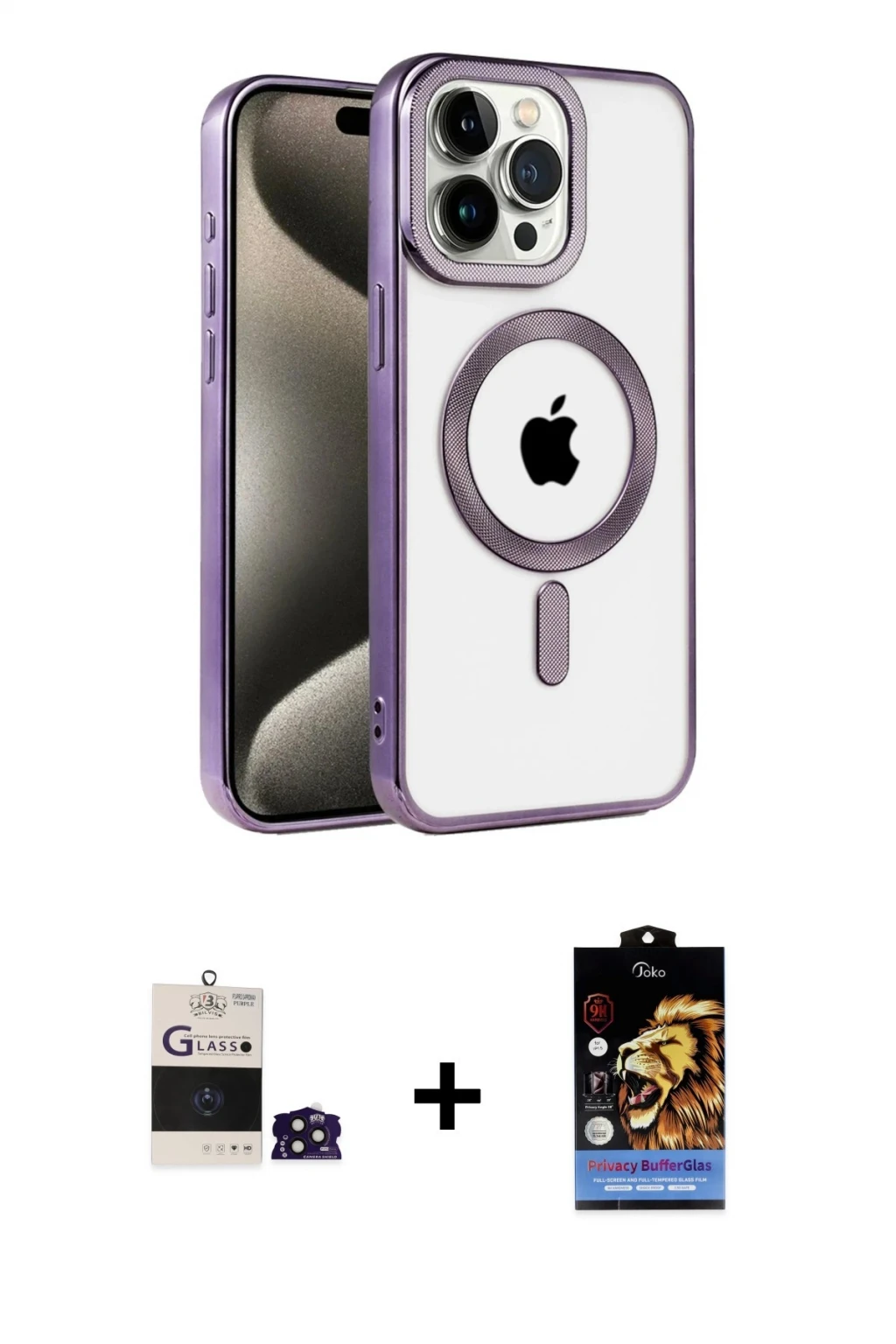 iPhone 14 Pro Max Kılıf Eksen Form Koleksiyonu - Siyah Buffer Hayalet Cam Ekran Koruyucu + Derin Mor Bilvis Titan Kamera Lens