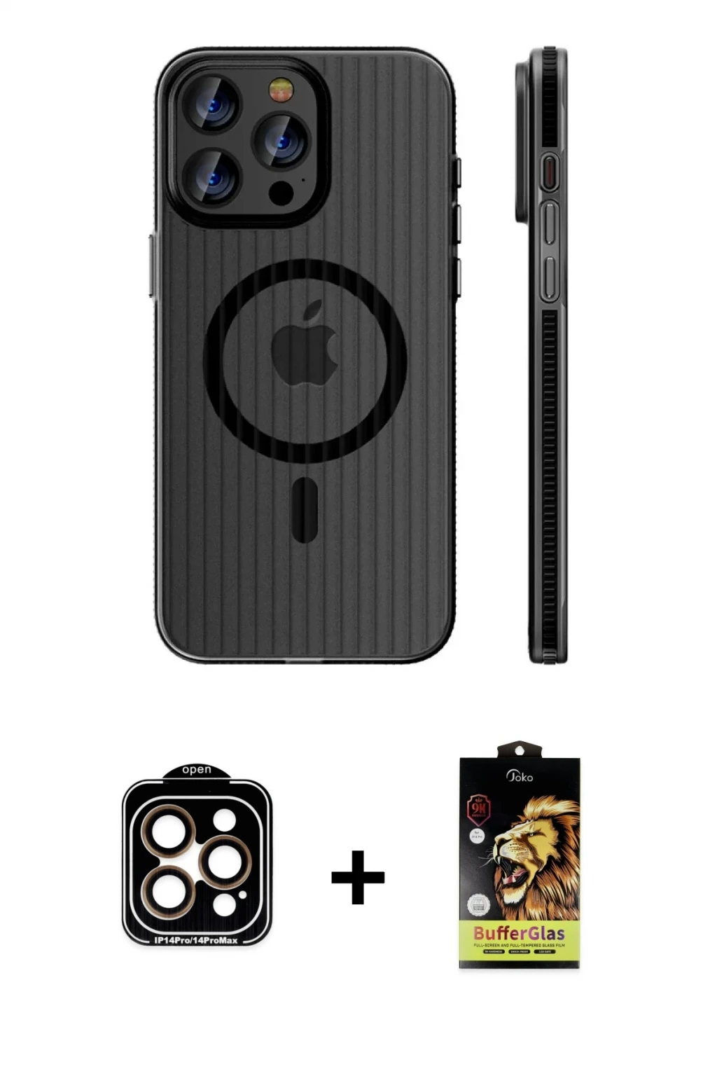 ieg™ iPhone 15 Pro Max Kılıf Kozmos Çizgi Prime - Siyah Buffer Hayalet Cam Ekran Koruyucu + Raze Metal Kamera Lens - LT