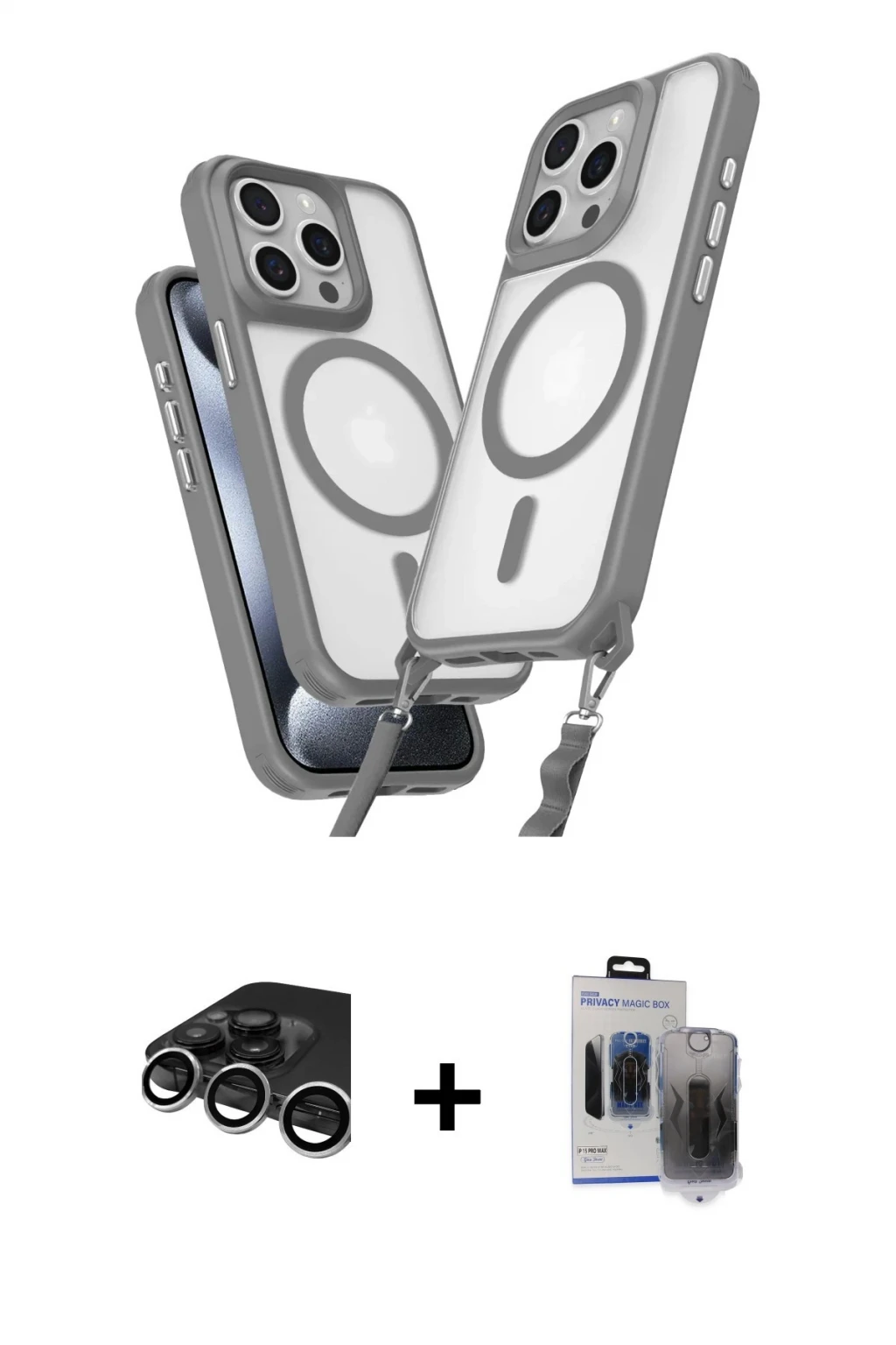 iPhone 15 Pro Max Atlas Doku Koleksiyonu - Siyah Vanessa Magic Hayalet Cam + Gümüş Raze Metal Kamera Lens, iPhone 15 Pro Max modeli için kılıf, ekran koruyucu ve kamera lens koruyucuyu bir araya getiren premium bir settir. Görünümde kılıfta Siyah tonu, lens koruyucuda Gümüş detay ile bütünlüklü ve dikkat çekici bir stil sunar. Set; tam uyumlu koruma, ekranı çizilme ve darbelere karşı destekleyen koruma ve kamera bölümünü ekstra güvenceye alan koruma sağlayarak cihazınızı günlük kullanıma karşı destekler. Tek paketle hem estetik hem de kapsamlı korumayı pratik şekilde tamamlayabilirsiniz.
