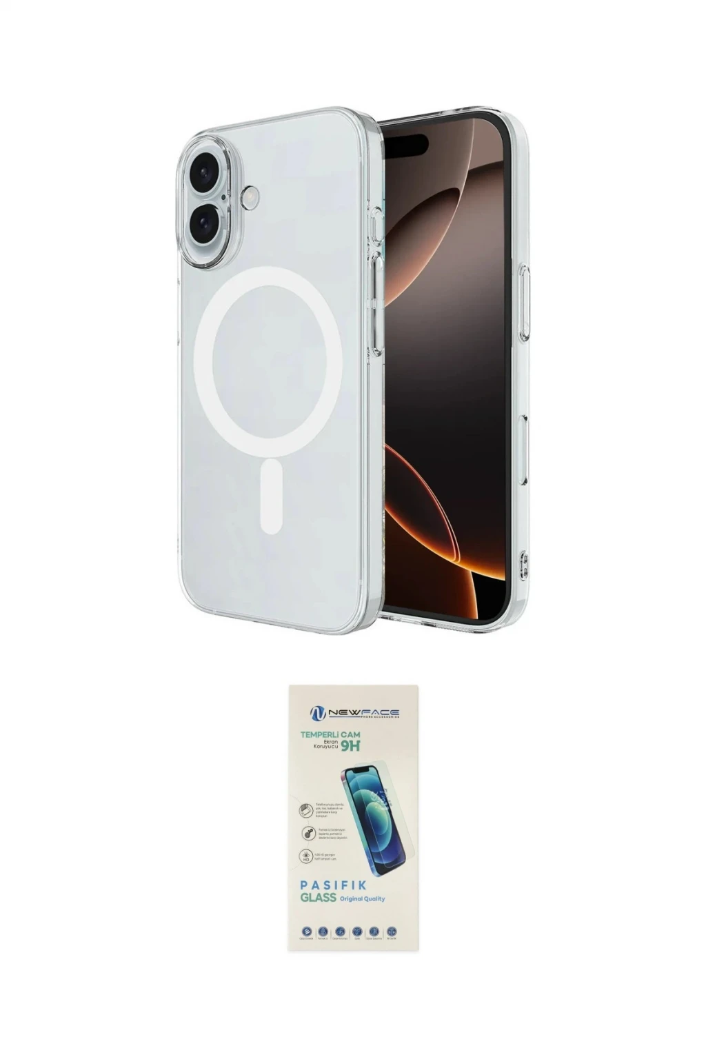 iPhone 16 Plus Kılıf Ahenk Yansıma Prime - Şeffaf Pasifik Cam Ekran Koruyucu, iPhone 16 Plus modeli için kılıf ve ekran koruyucuyu bir araya getiren uyumlu bir settir. Kılıfta Şeffaf tonu ile görünümü tamamlar, ekran koruyucu ile günlük kullanımda dengeli koruma sunar. Newface iPhone 16 Plus Kılıf Magneticsafe Şeffaf Silikon - Şeffaf cihazın gövdesini desteklerken, Newface iPhone 16 Plus Pasifik Cam Ekran Koruyucu ekranı çizilme ve darbelere karşı tamamlayıcı koruma sağlar. Tek paketle hem görünümü hem de temel korumayı hızlıca tamamlayabilirsiniz.