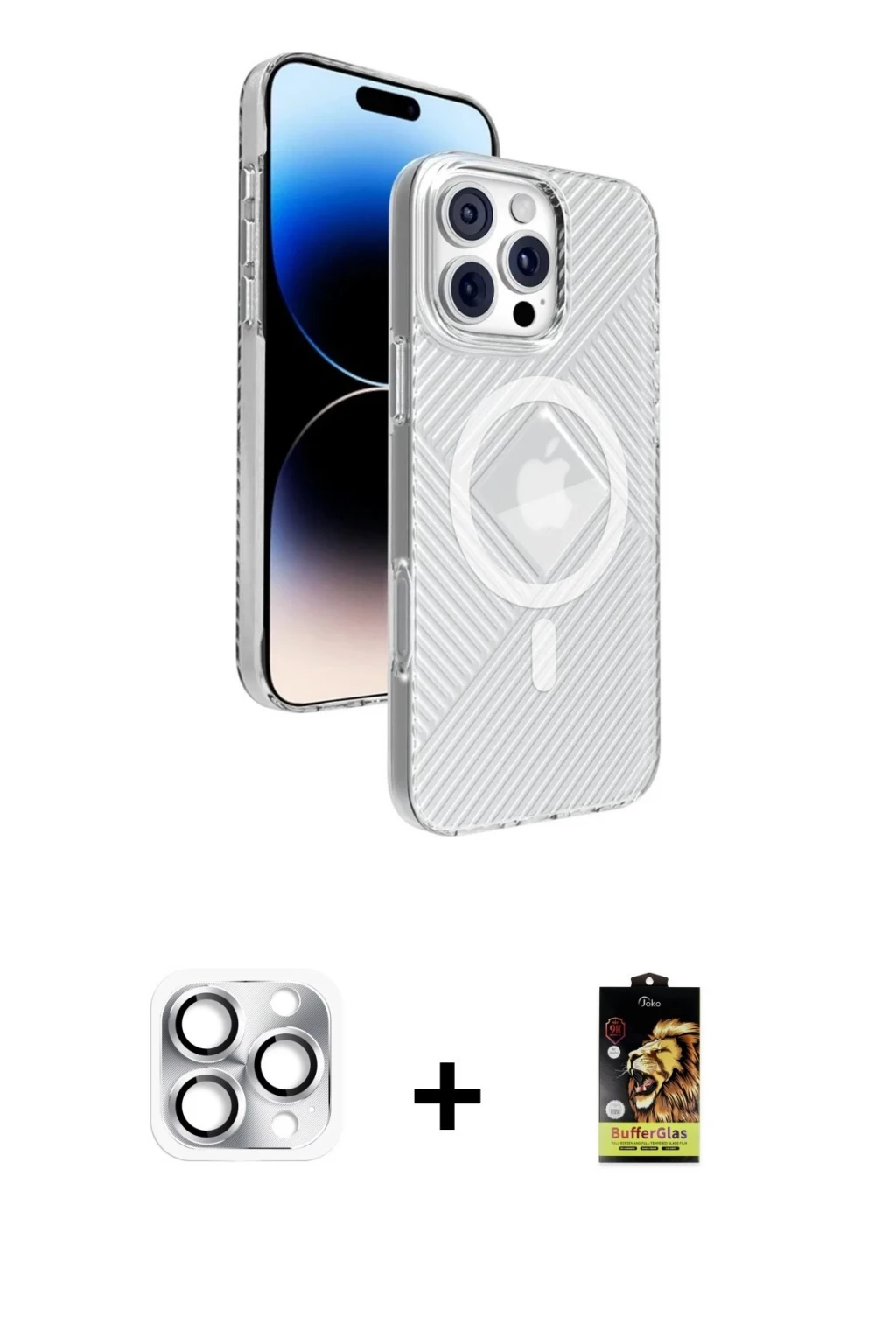 iPhone 16 Pro Max Nova Modern Prime - Siyah Buffer Cam Ekran Koruyucu + Gümüş Pers Alüminyum Kamera Lens, iPhone 16 Pro Max modeli için kılıf, ekran koruyucu ve kamera lens koruyucuyu bir araya getiren premium bir settir. Görünümde kılıfta Siyah tonu, lens koruyucuda Gümüş detay ile bütünlüklü ve dikkat çekici bir stil sunar. Set; tam uyumlu koruma, ekranı çizilme ve darbelere karşı destekleyen koruma ve kamera bölümünü ekstra güvenceye alan koruma sağlayarak cihazınızı günlük kullanıma karşı destekler. Tek paketle hem estetik hem de kapsamlı korumayı pratik şekilde tamamlayabilirsiniz.