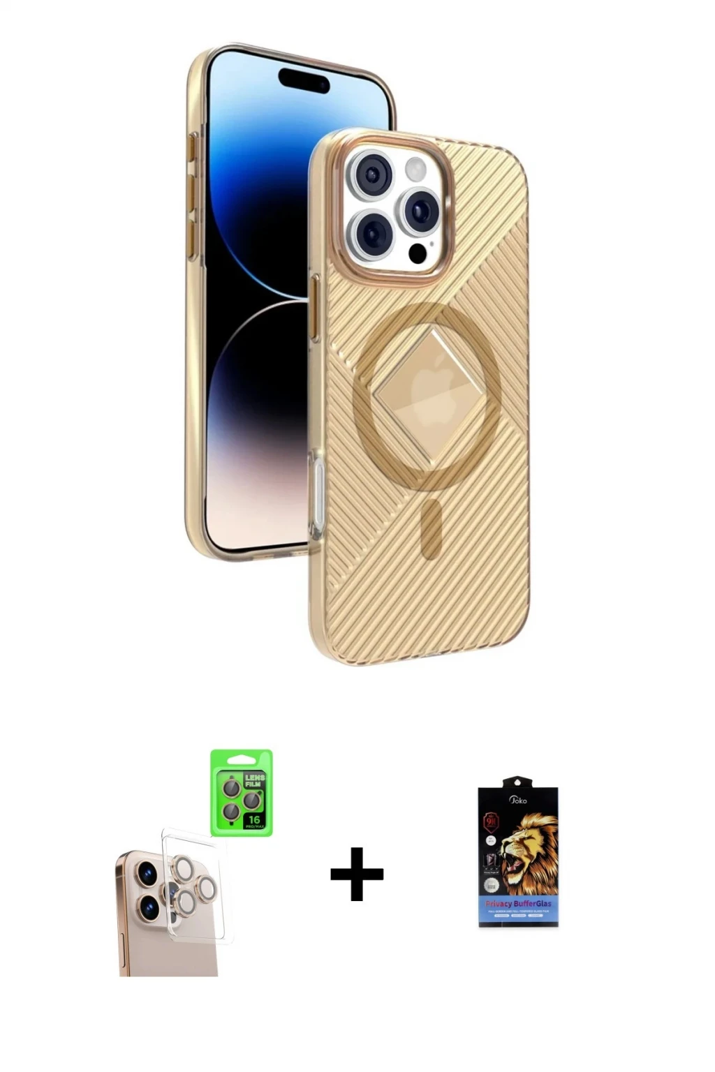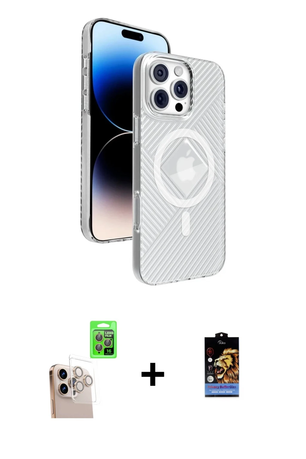 ieg™ iPhone 14 Pro Max Kılıf Siluet Modern Koleksiyonu - Şeffaf Royal Nano Ekran Koruyucu + PVD Metal Kamera Lens - TU