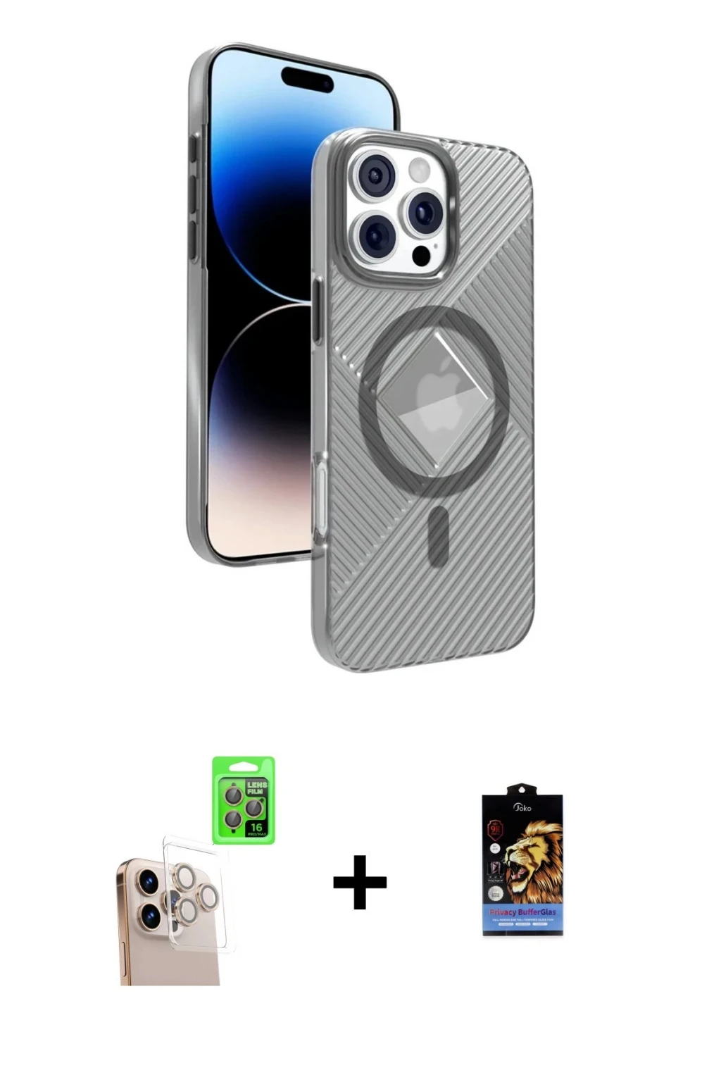 iPhone 16 Pro Max Kılıf Nova Modern Prime - Siyah Buffer Hayalet Cam Ekran Koruyucu + Natural Grey Raze Metal Kamera Lens