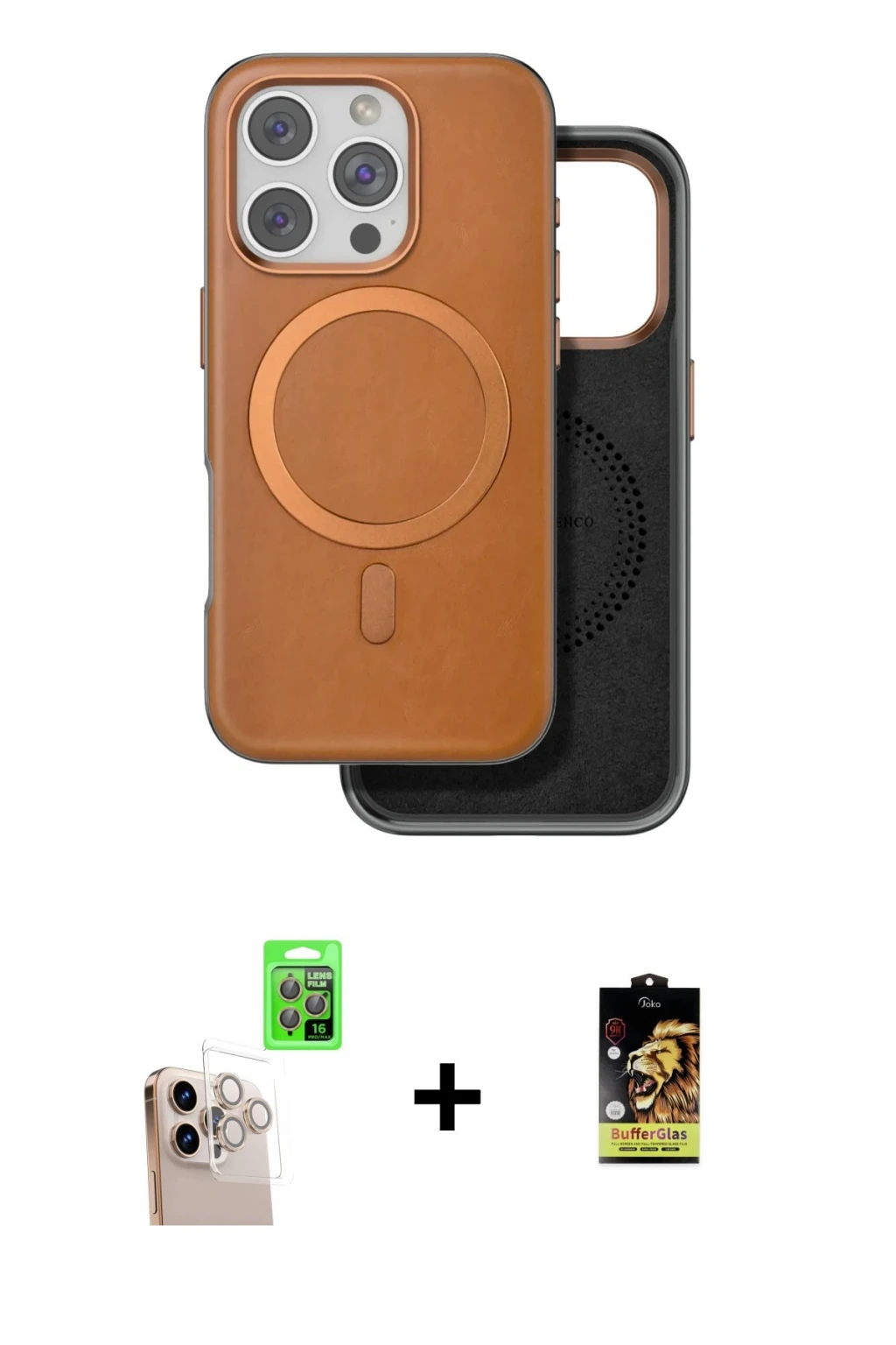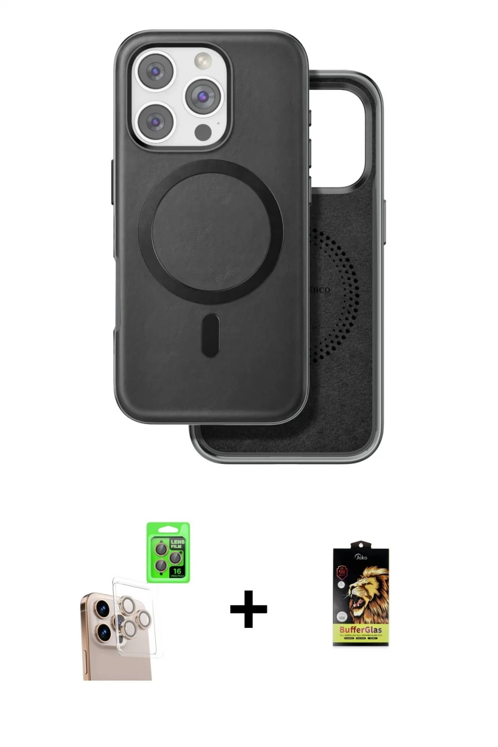 iPhone 16 Pro Max Kılıf Pusula Işık Koleksiyonu - Siyah Buffer Cam Ekran Koruyucu + Natural Grey Raze Metal Kamera Lens