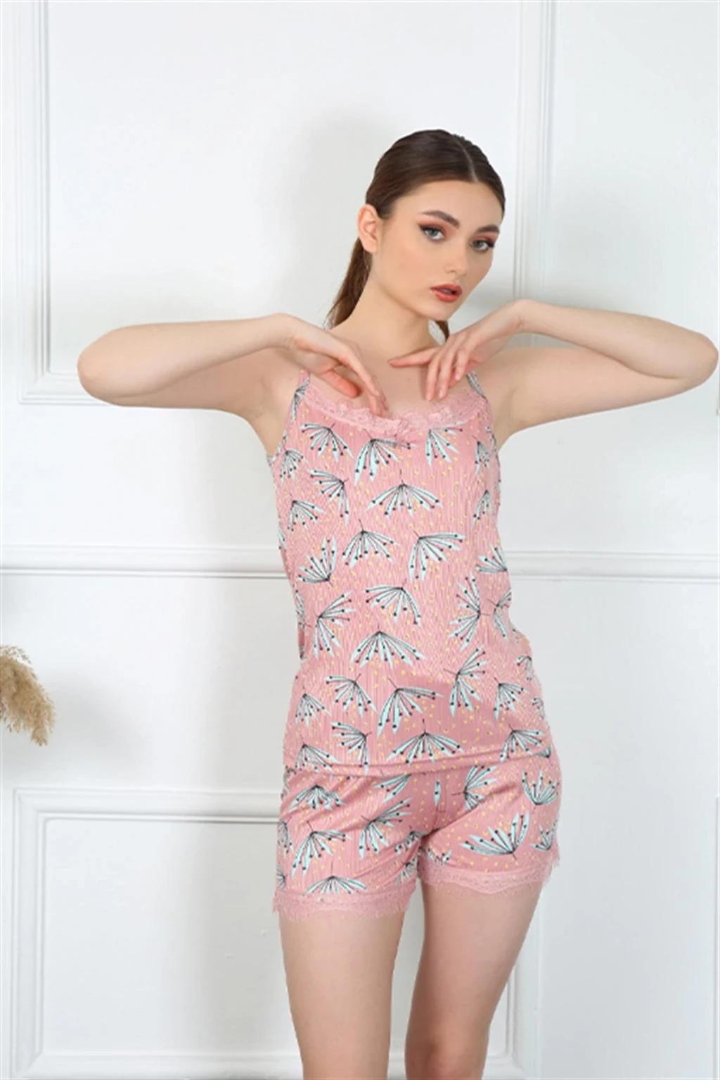 İnce ip askı detaylarıyla şıklık kazanan takımın somon rengi, her ten rengine uyum sağlar.