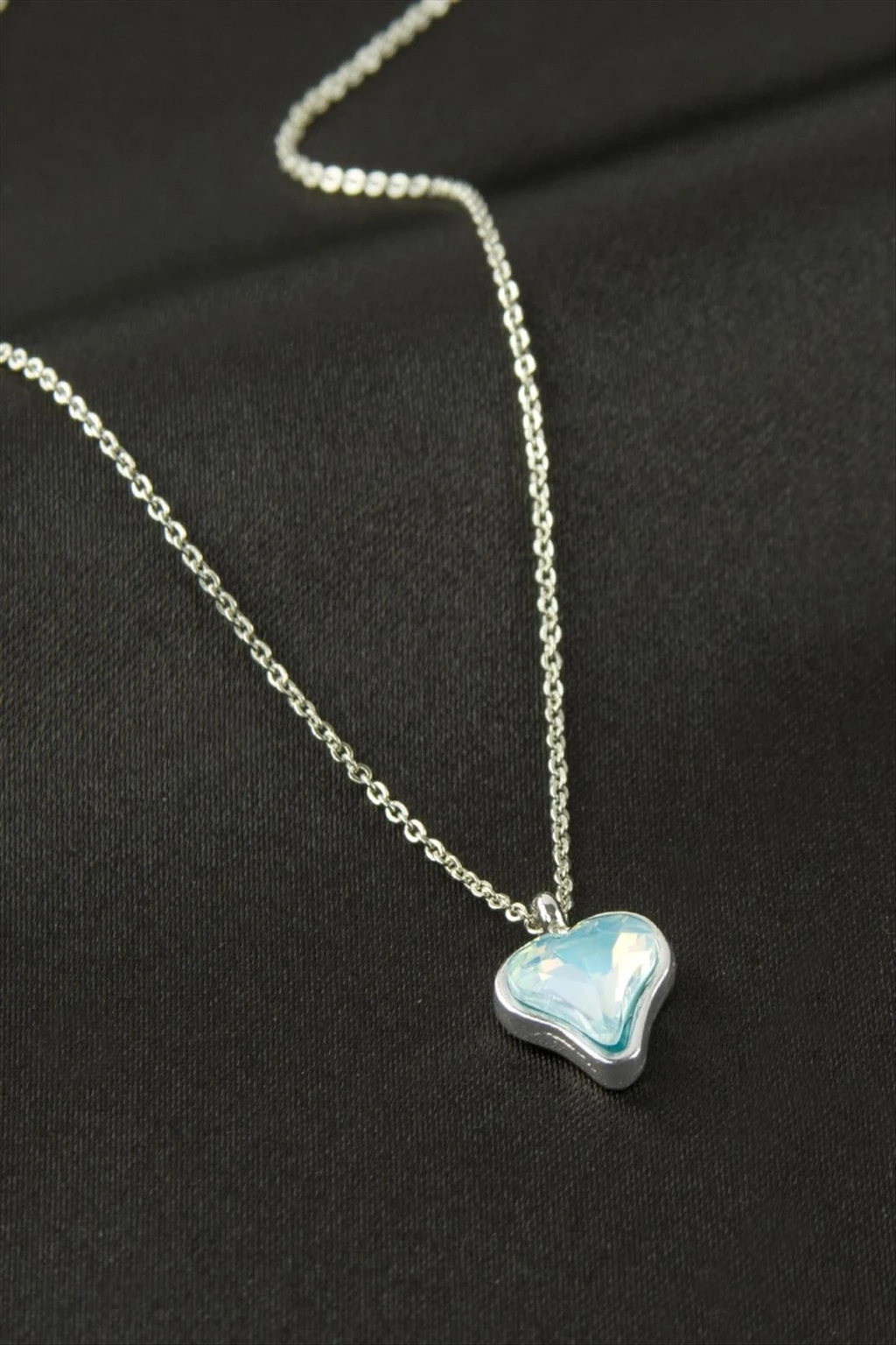 Kolye; Ürün malzemesi zincir bölümü çeliktir. Zincir uzunluğu 45 cm ve ucundaki cam taş boyu 1 cmdir. Kartlıdır.