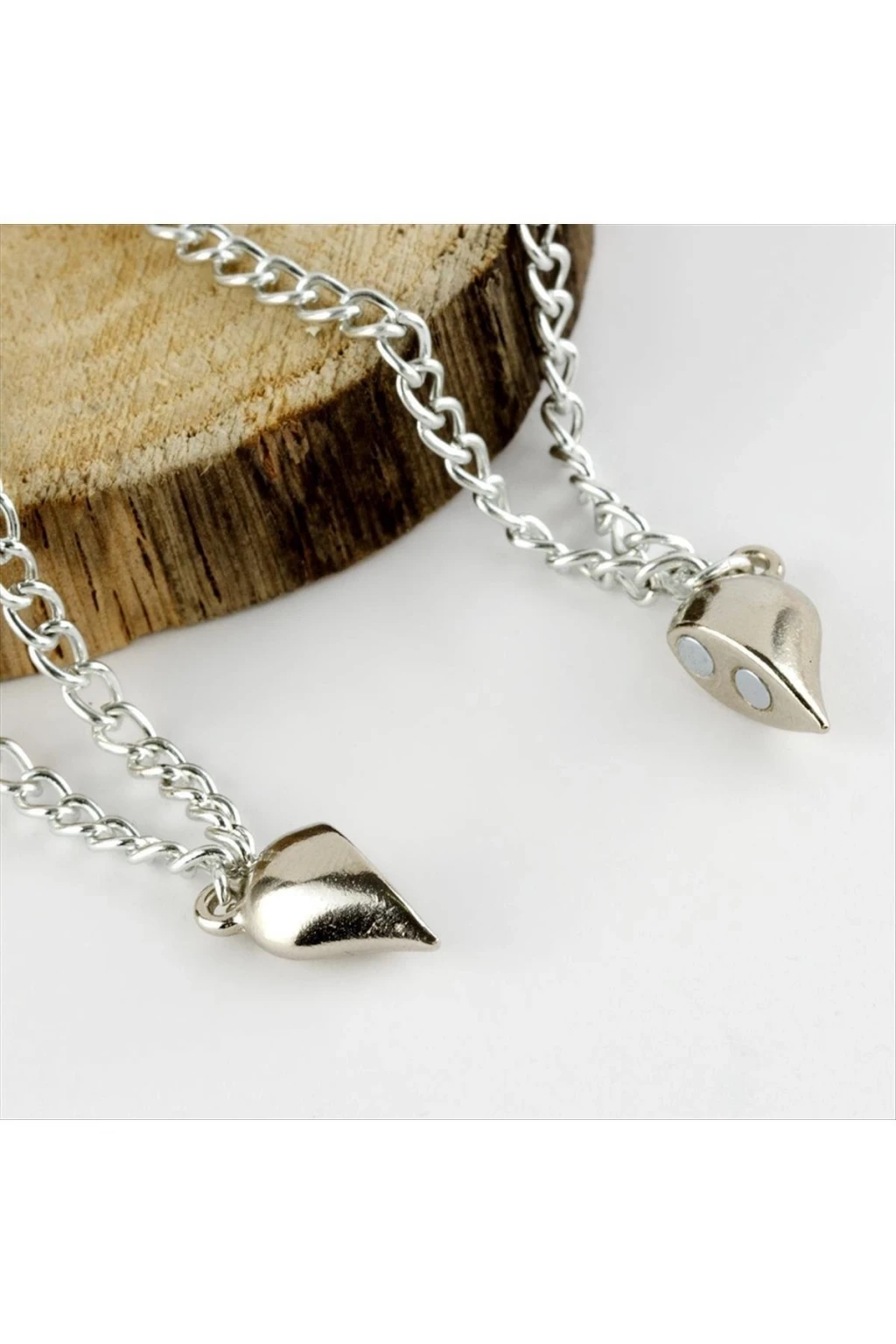 Kolye; Ürün malzemesi metaldir. Ürün zincir uzunluğu 45 cmdir. Kartıyla beraber gönderilecekdir. Kalp figürünün ortasında mıknatıs bulunmaktadır. Çift olarak gönderilecektir.