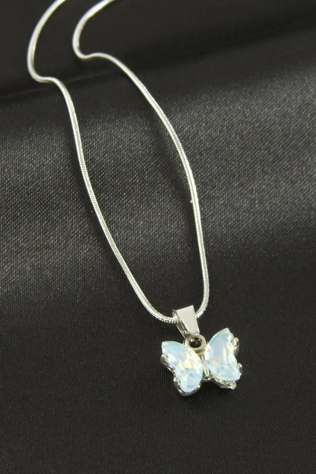 Kolye; Ürün malzemesi zincir bölümü çeliktir. Zincir uzunluğu 40 cm ve ucundaki cam taş boyu 1,2 cmdir. Kartlıdır.
