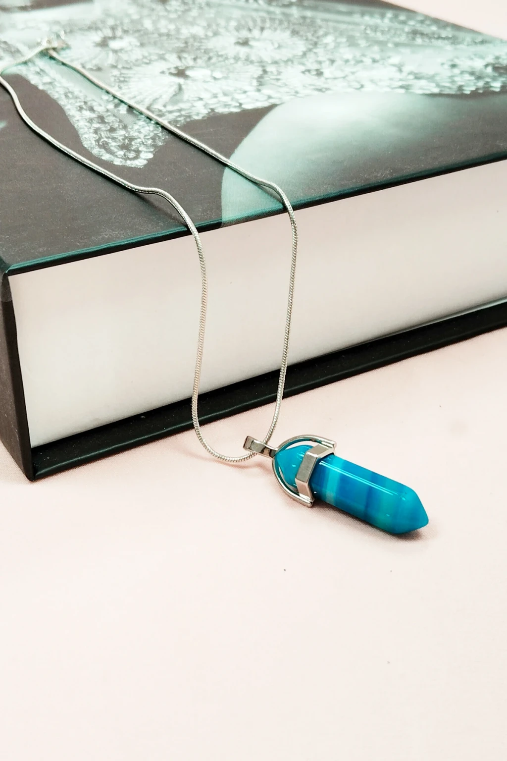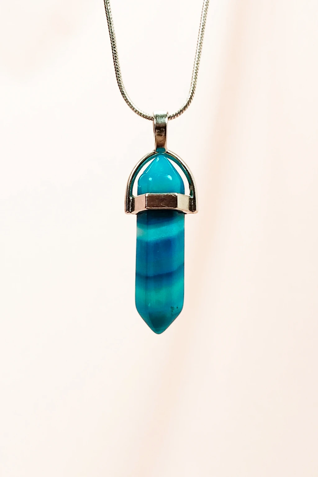 Mavi Akik Doğal Taşı Zincirli El Yapımı Tasarımlı Kolye Uç: 3,5 cm Zincir: 20 cm Kutulu