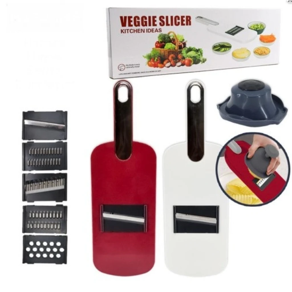 MULTİFONKSİYONEL MUTFAK RENDE SETİVeggie Slicer Multifonksiyonel Mutfak Rende Seti mutfakta işlerinizi kolaylaştırmak için tasarlanmış çok yönlü bir mutfak rendesi. Beş farklı doğrama başlığı sayesinde sebzelerinizi veya meyvelerinizi istediğiniz şekilde hazırlayabilirsiniz. Üstelik, rendelerken güvenliği artırmak için elinizi korumak için özel bir el koruyucu aparatı da bulunuyor. Pratik ve kullanışlı yapısıyla Veggie Slicer, mutfakta zaman kazandırırken aynı zamanda güvenli bir kullanım sağlıyor.Paket İçeriği1 adet multifonksiyonel mutfak rende seti veggie slicer