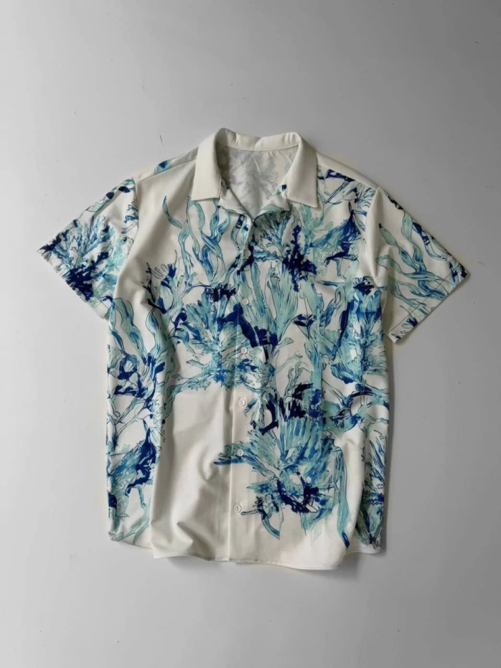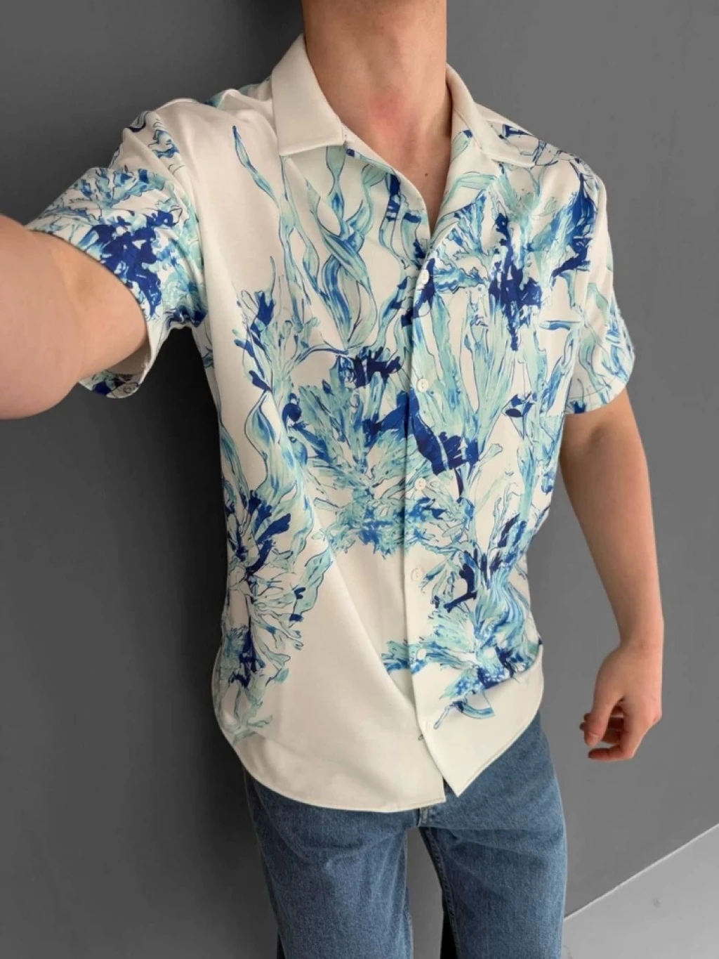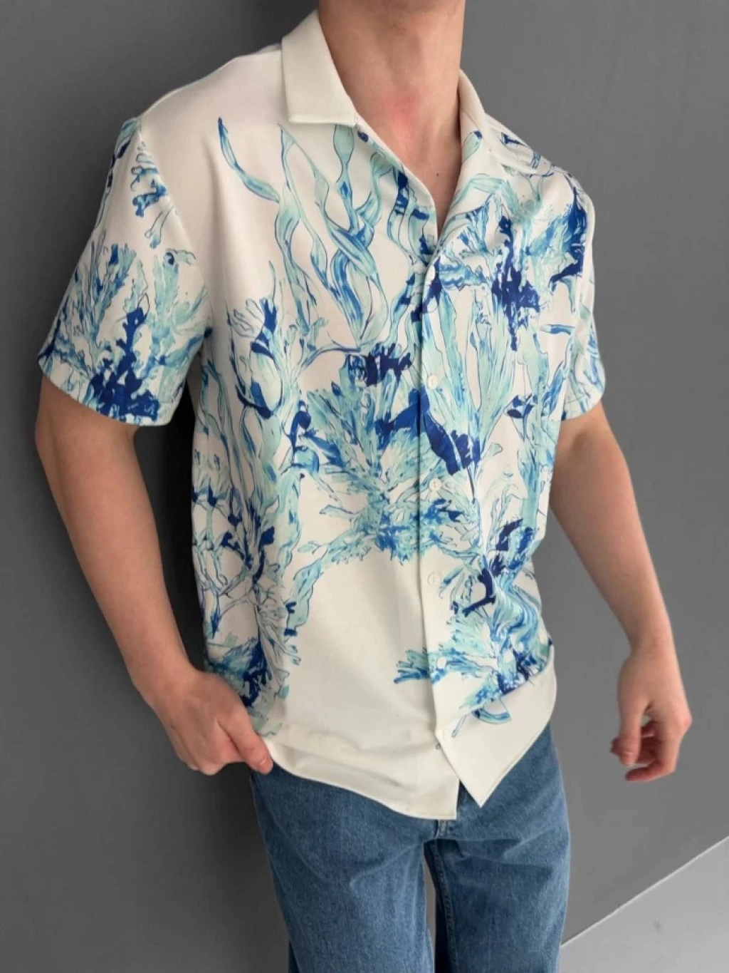 İki İplik Kumaş Baskılı Gömlek - Mavi