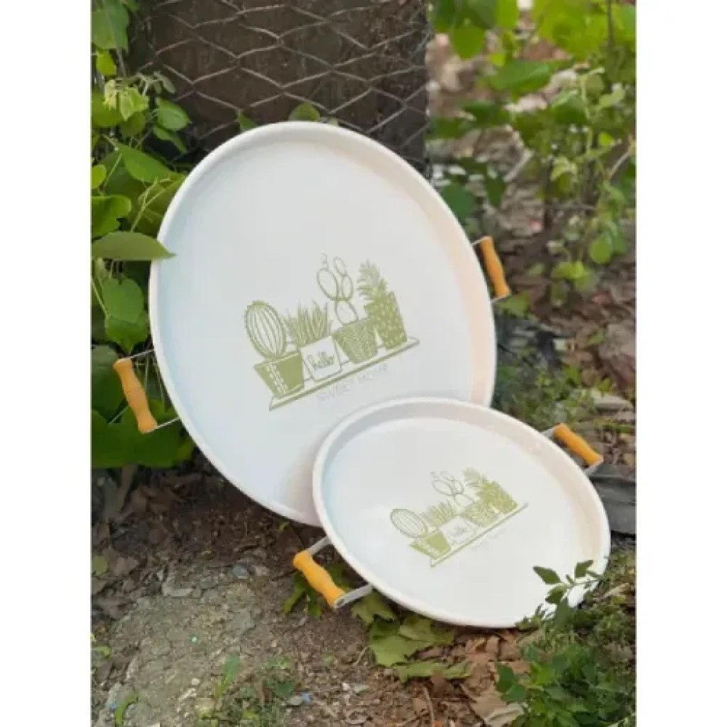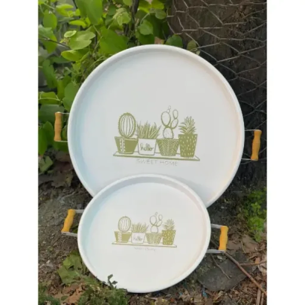 Ürün ÖzellikleriBüyük boy tepsinin çapı 51 cm, küçük boy tepsinin çapı ise 37 cm'dir. Bu şık ikili tepsi seti, yuvarlak formu ve estetik tasarımıyla mükemmel bir sunum aracıdır. Ahşap tutma kulpları sayesinde rahatlıkla taşınabilir. Hem işlevsel hem de dekoratif olarak kullanılabilir. Evde misafir ağırlarken, kahve saati sunumları veya yemek servisleri için ideal bir seçenektir. Modern tarzı ve pratikliğiyle her evde yerini alacak.Paket İçeriği2 Adet Yuvarlak Sunum Tepsisi