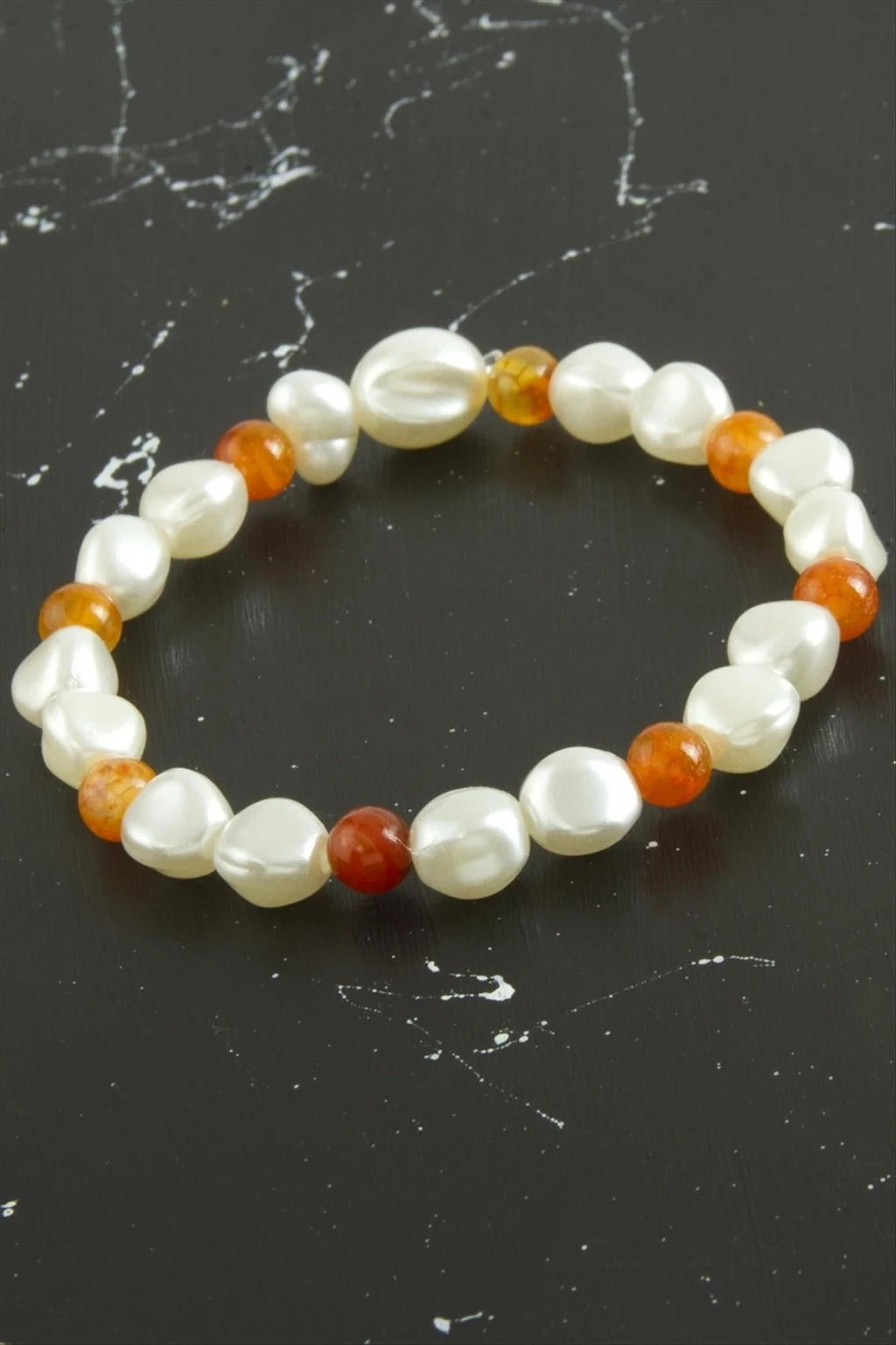 Bileklik; Ürün malzemesi inci ve akiktaşından imal edilmiştir. Misina üzerine dizilmiştir. Akik boyu 6 mmdir.
