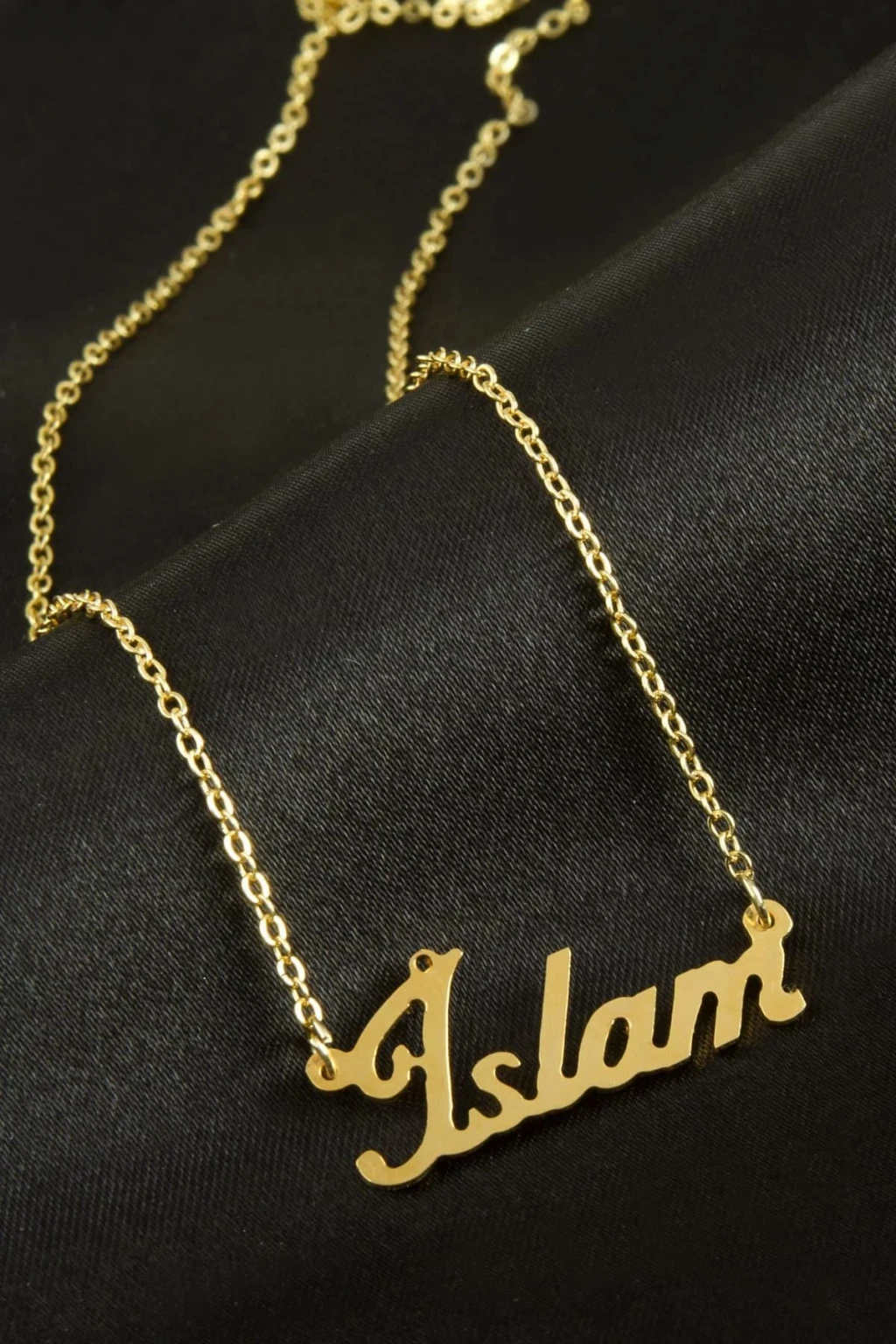 İslam İsimli Kolye. İsimli kolye pirinç madeninden ve altın kaplamalıdır. Kişiye özel üretilmektedir.Yazdırmak istediğiniz ismi bize mesaj olarak iletmeniz gerekmektedir. Kullanıma bağlı olarak uzun süre kullanıma uygundur. Ürün malzemesi 1.sınıf kalitededir. Ürün ve zinciri sarı renktedir. Ürün zincir boyu 45 cm ve ürün üzerindeki isimler yaklaşık 3 cmdir. İsim boyları ürün ismine göre degişiklik göstermektedir.