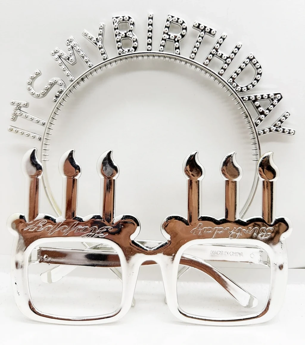 İt's My Birthday Yazılı Taç ve Mum Şekilli Gözlük Seti Gümüş Renk