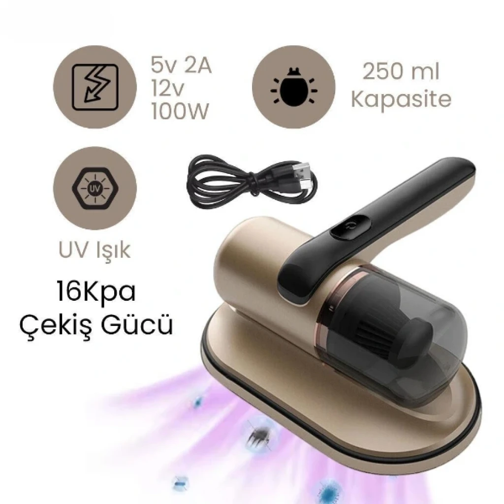 KABLOSUZ EL SÜPÜRGESİ GOLDÜrün ÖzellikleriKablosuz El Süpürgesi Gold modeli, 16Kpa yüksek çekiş gücüyle toz, kir, mite ve alerjenleri etkili şekilde temizler. UV ışık teknolojisi sayesinde yüzeylerdeki mikroorganizmaları yok ederken daha hijyenik bir temizlik sağlar. Kompakt ve ergonomik tasarımı sayesinde hem yatay hem dikey yüzeylerde kolaylıkla kullanılabilir. 250 ml toz haznesiyle pratik kullanım sunar ve hazne kolayca boşaltılabilir. 5V 2A / 12V 100W güçle çalışan ürün, USB kablo ile şarj edilir ve kablosuz yapısı sayesinde özgürce hareket etmenize imkan tanır. Özellikle yatak, koltuk, yorgan, halı ve perde gibi tekstil yüzeylerinde derinlemesine temizlik için idealdir.Paket İçeriği1 Adet Kablosuz El Süpürgesi Gold