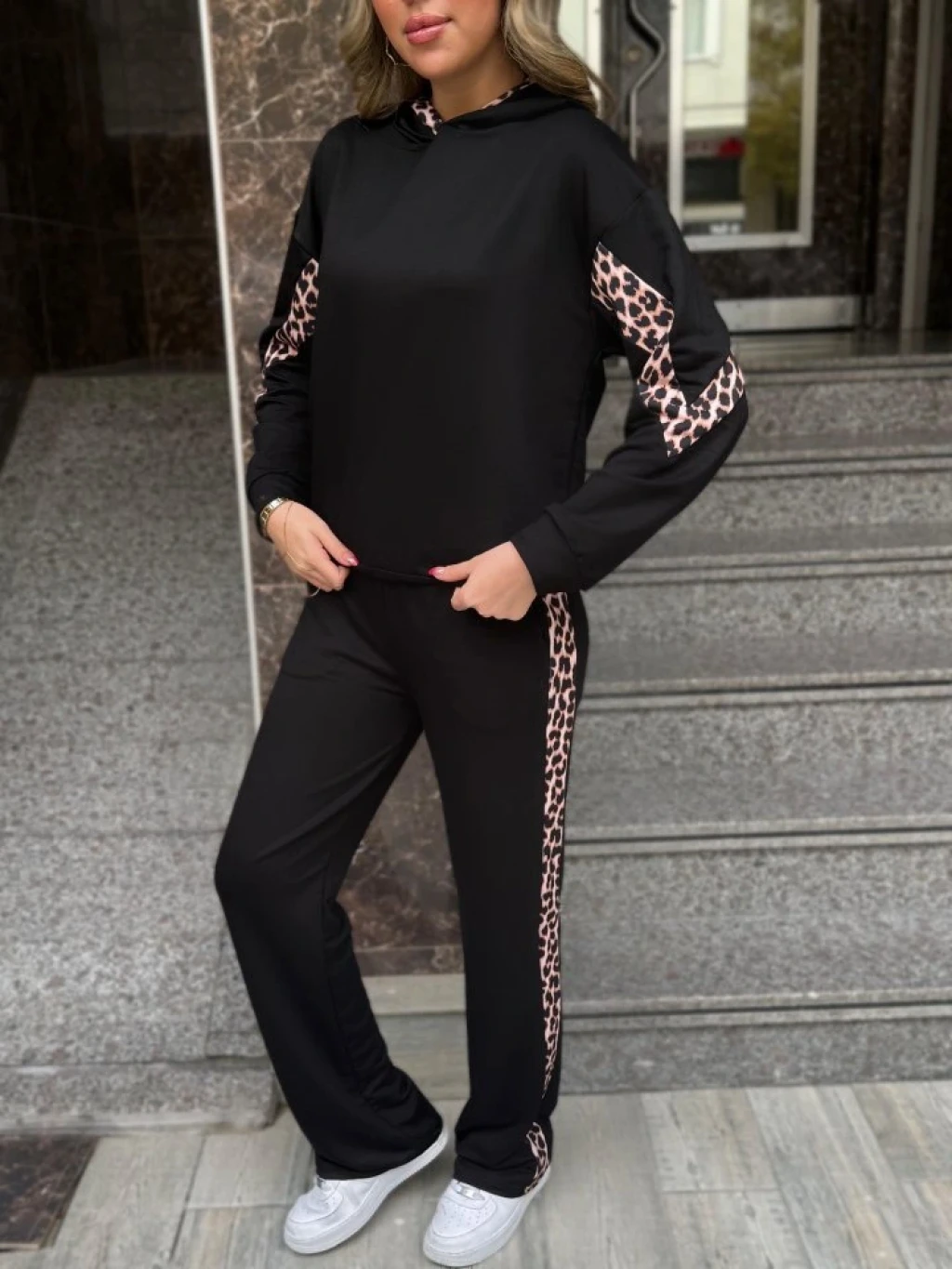 Kadın Kapüşonlu Leopar Detay Sweat Ve Yüksek Bel Yanları Leopar şeritli Bol Paça Pantolon Ikili Takım