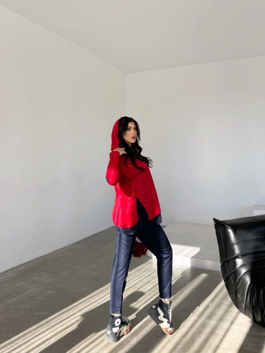 Kadın Kırmızı Kapşonlu Etek Ucu Detay Arma Ters Dikiş Gorunumlu Ikili Takım
