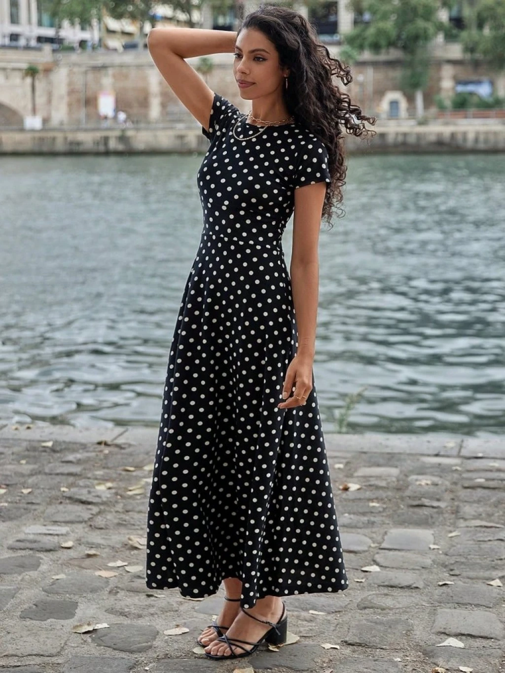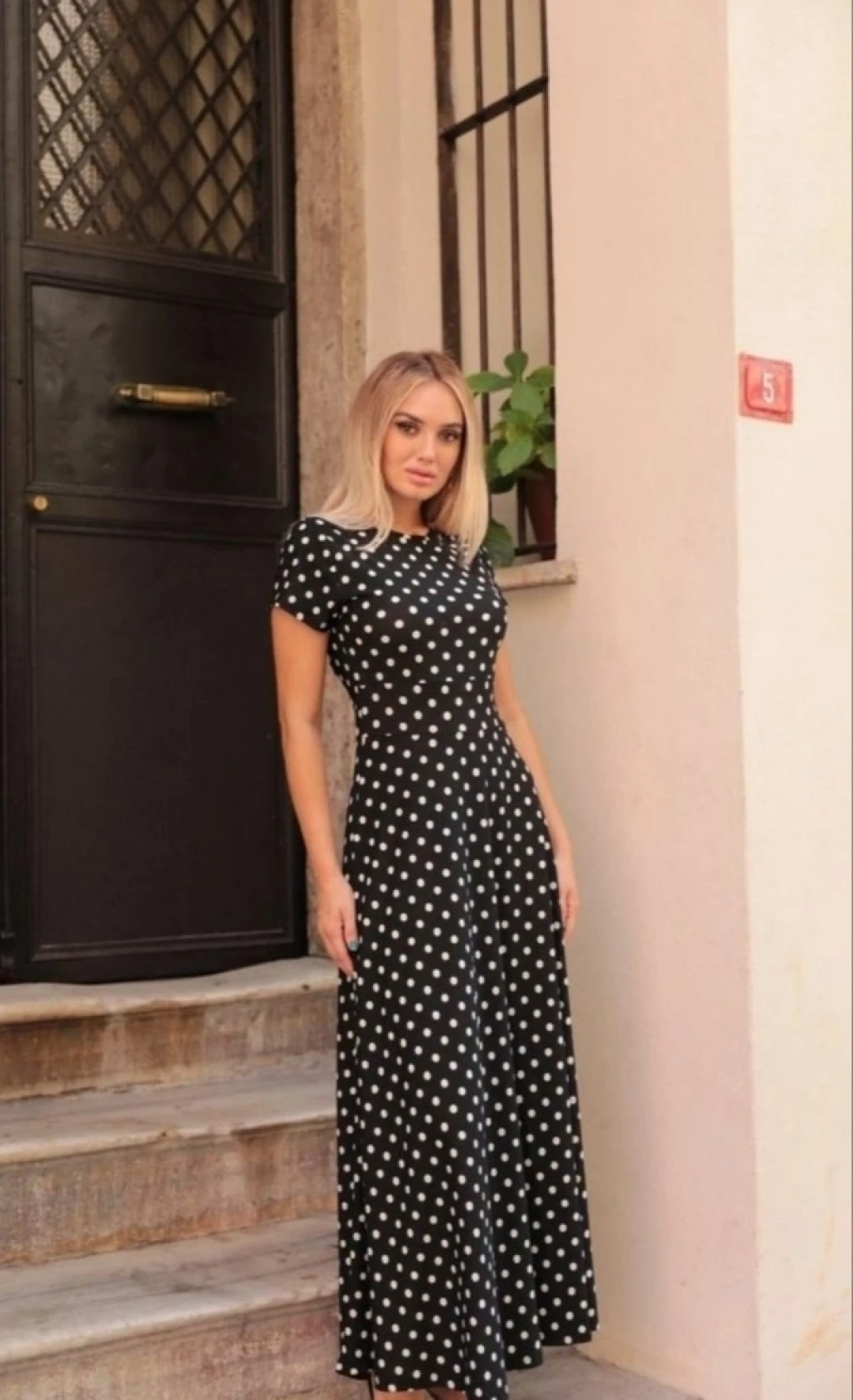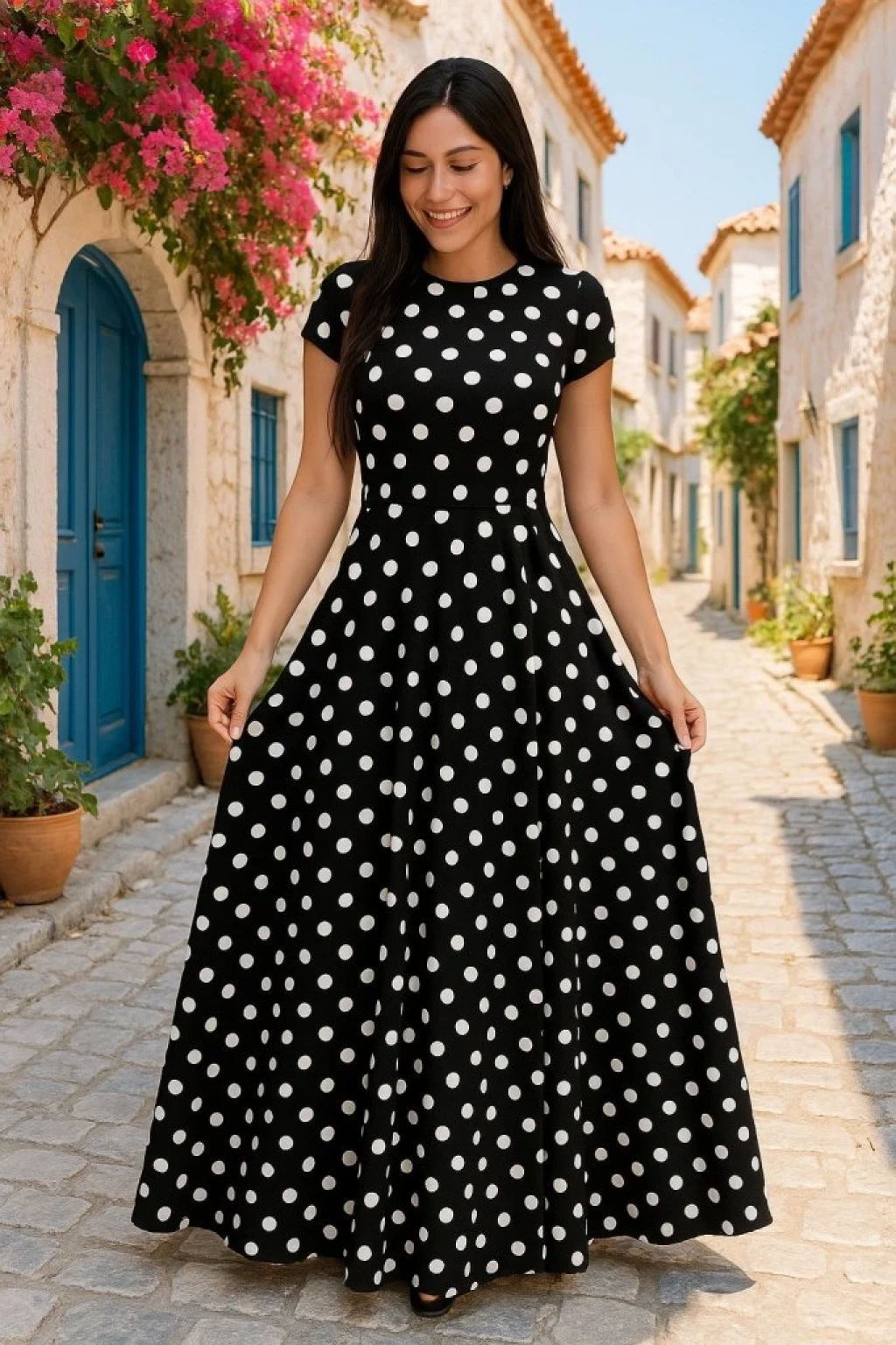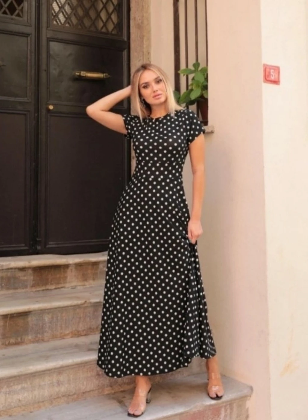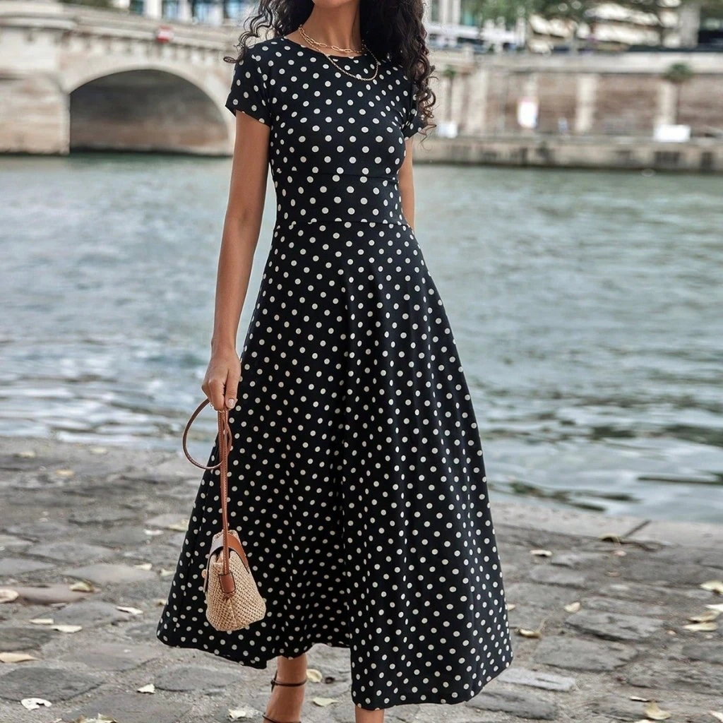 Kadın Kısa Kollu Bisiklet Yaka Puantiyeli Maksi örme Krep Elbise