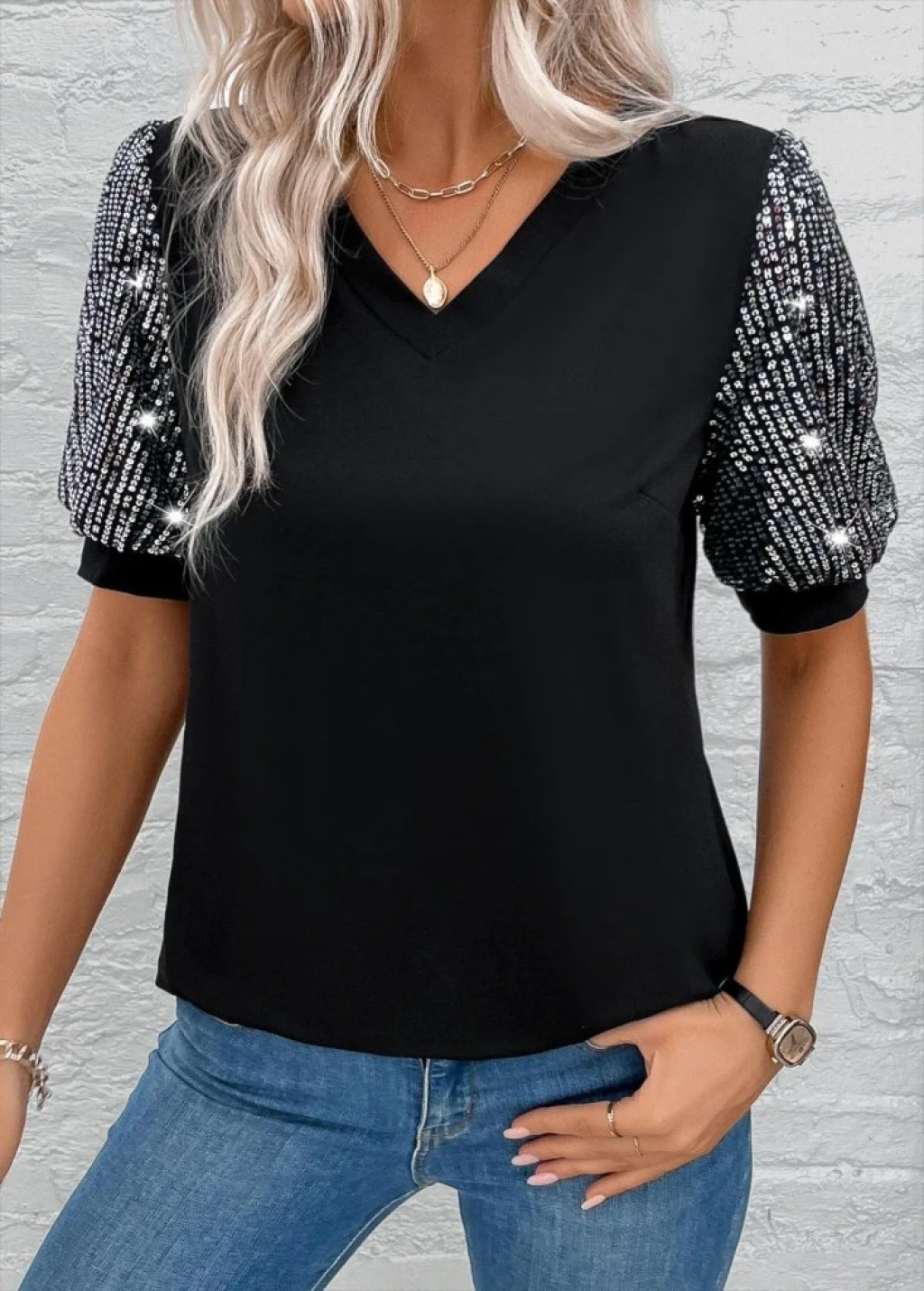 Kadın Kısa Kollu V Yakalı Pul Payet Detaylı Viskon Bluz