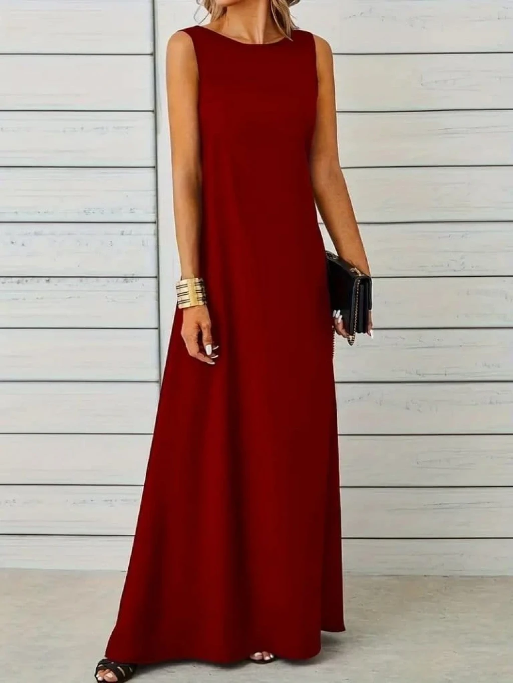 Kadın Kolsuz Kayık Yaka Maksi Janjan Krep Elbise