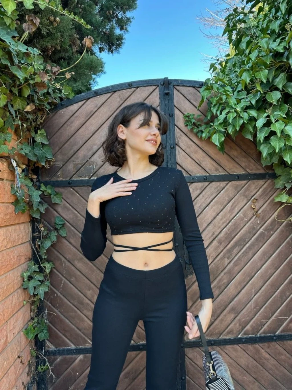 Kadın Paçası Yırtmaç Detaylı Taşlı Bel Bağlamalı Kaşkorse İkili Takım